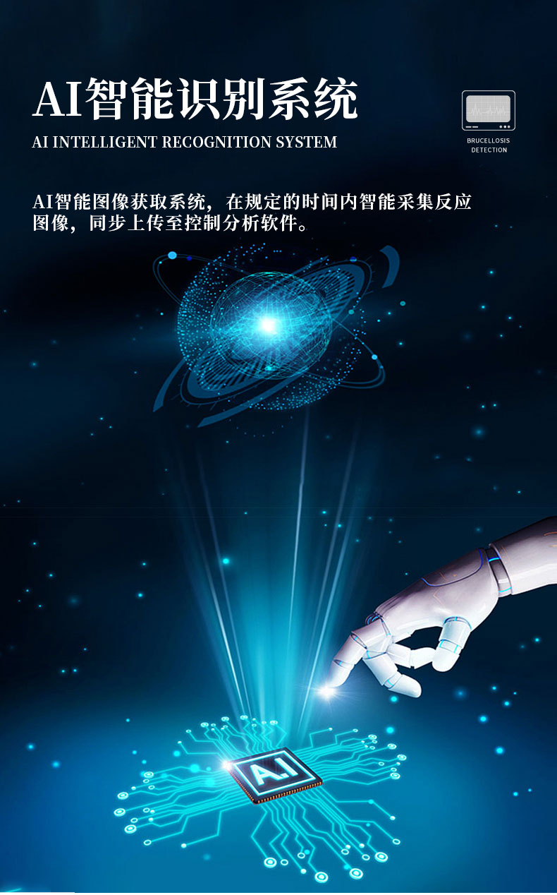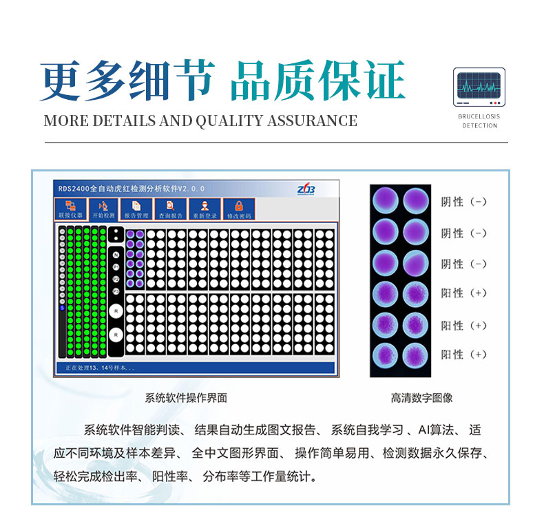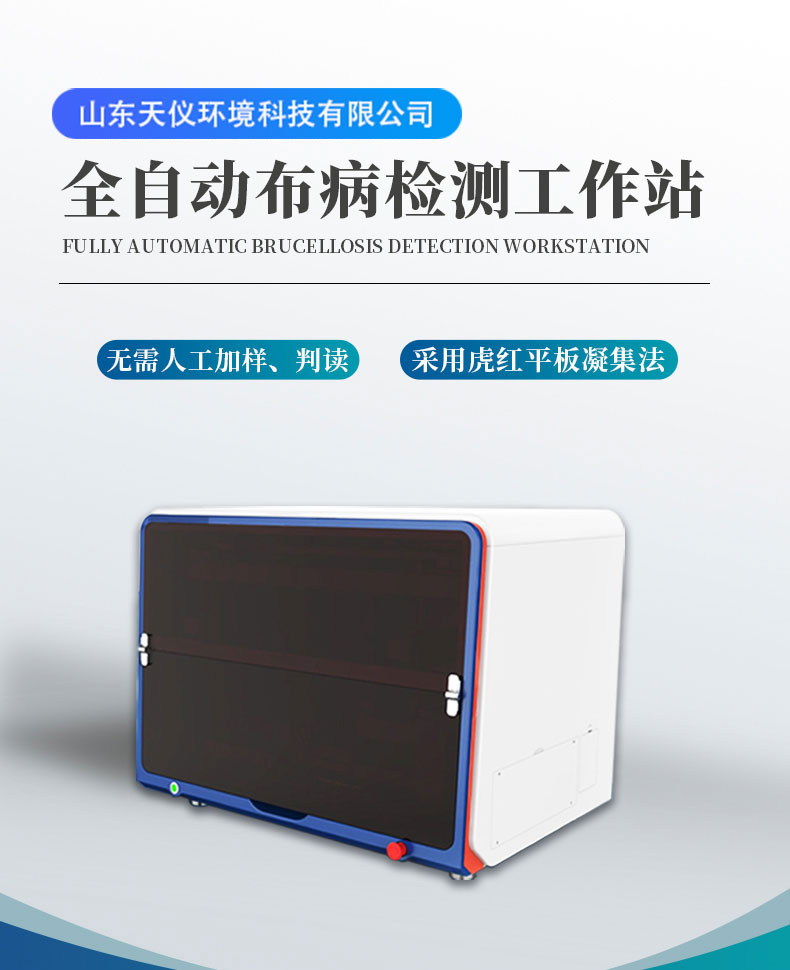 【产品简介】一、全自动布病检测工作站系统原理、规格1.采用布鲁氏杆菌检测方法学国标检测法中虎红平板凝集试验、结合机械手臂自动添加样本、虎红抗原、智能涡轮混匀系统、AI图像识别、专用软件分析系统···