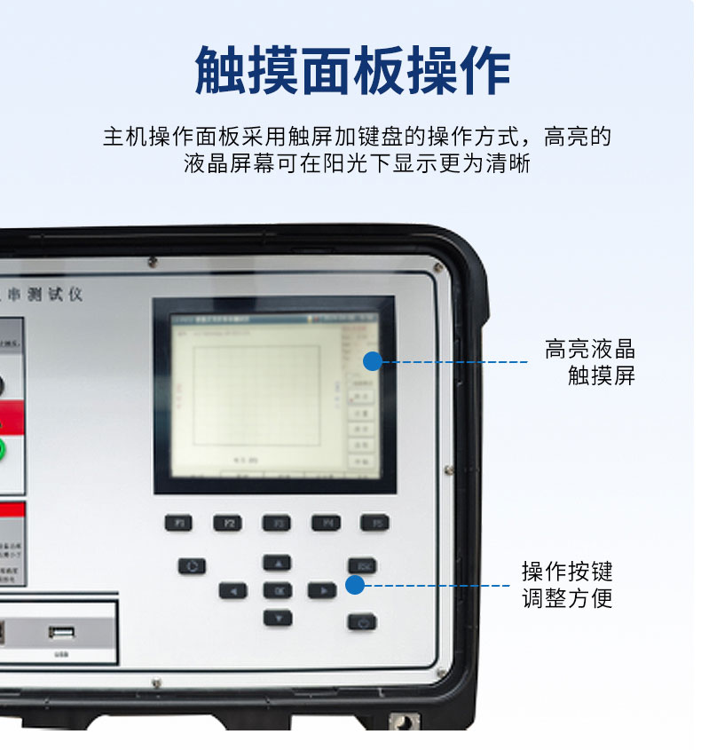 主机操作面板采用触屏加键盘的操作方式,高亮的液晶屏幕可在阳光下显⽰更为清晰,整机包含丰富的外设接又提供多种拓展联机功能。