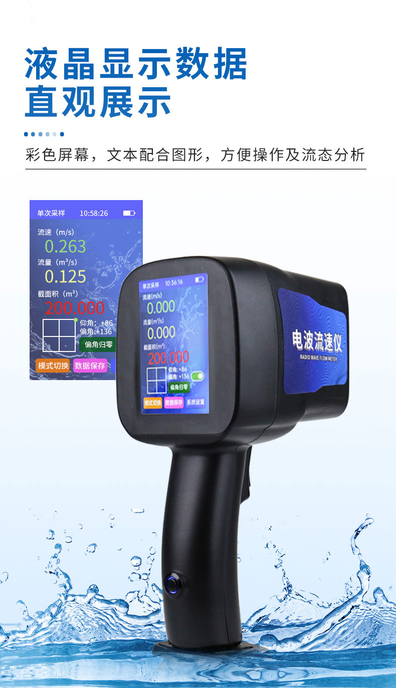 流量测量:输入被测断面类型,并手工输入(或者通过辅助传感器测量)规则断面的水位、宽度计算断面面积,仪表更具Q=V*S测算流速Q值