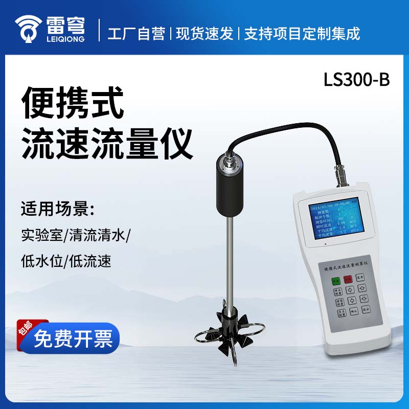 LS300-B型便携式流速仪可搭配流速传感器使用,该传感器旋浆螺旋角、螺距、制作工艺和材料等分别进行了重新设计。测量明渠流速流量等参数。