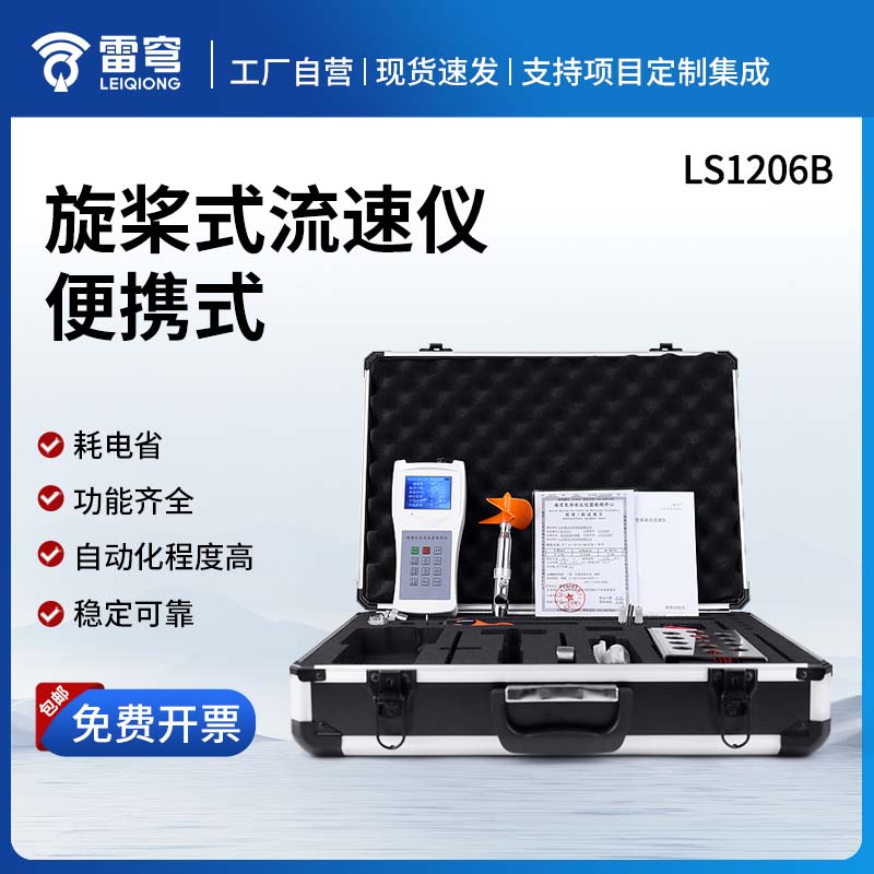 便携式流速仪主要由LS1206B型旋桨式流速传感器、流速测算仪、0.4m×4Ф16测杆组成。全套仪器置于高级铝合金密码箱内。接通信号线,即可进行各明渠中流速的测量,并自动显示流速。