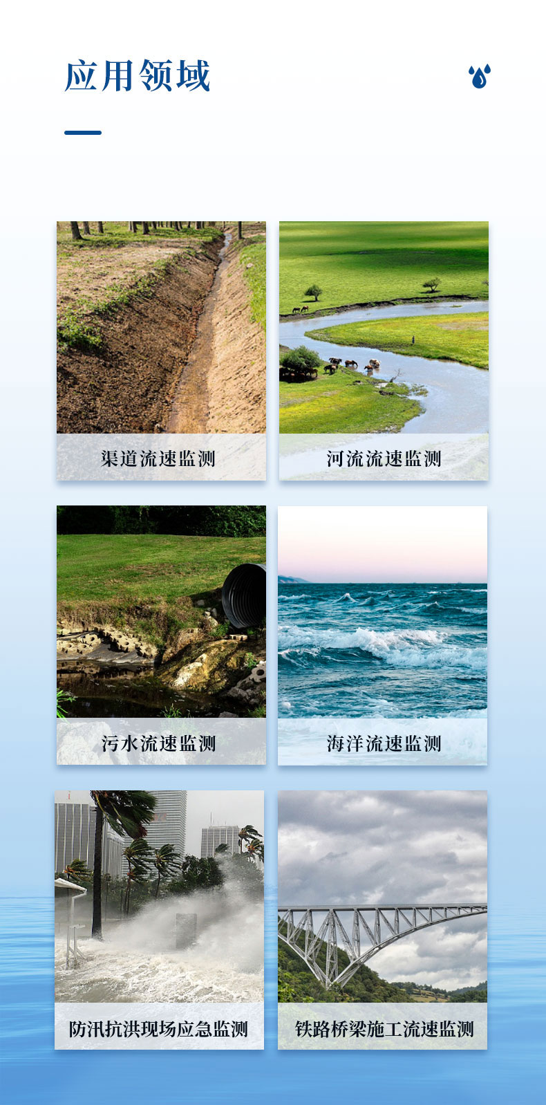 渠道流速监测、河流流速监测、污水流速监测、海洋流速监测、铁路桥梁施工流速监测;防汛抗洪现场应急监测、污水排放监测、其他需要现场测量的场合等。