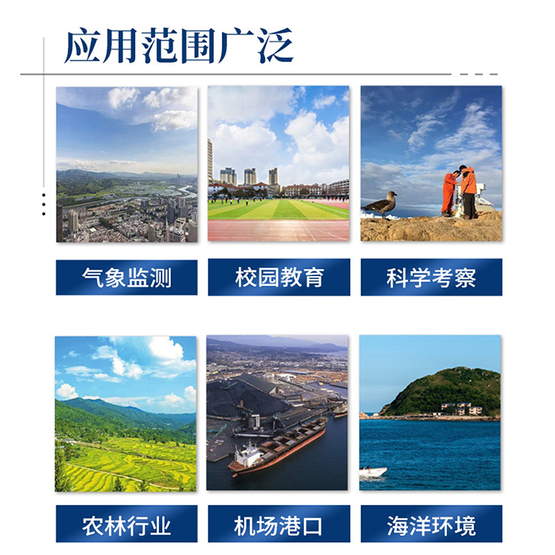 该设备支持无线传输,免调试,可快速布置,适用于各类应急气象短期观测、移动气象监测等气象数据的获取。广泛运用于气象、农林、环保、海洋、机场、港口、科学考察、校园教育等领域
