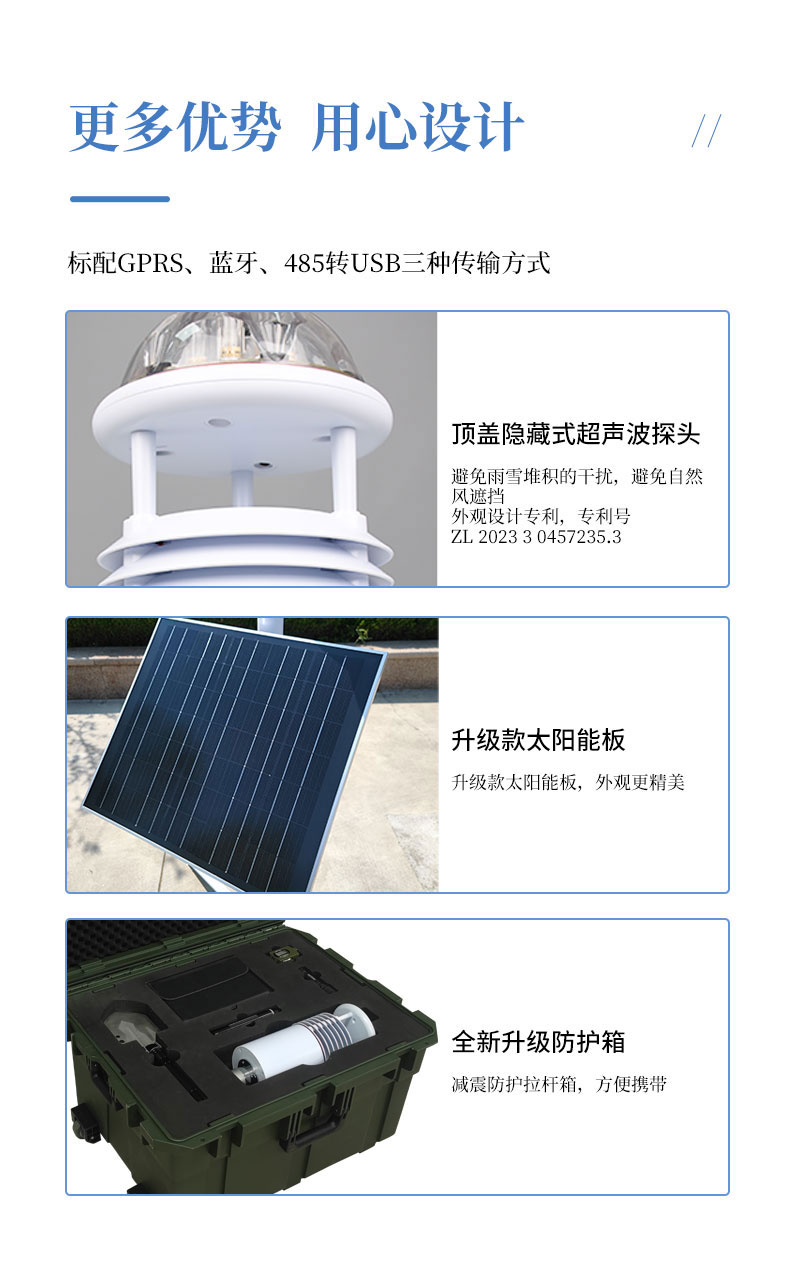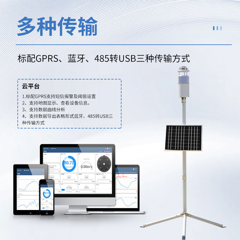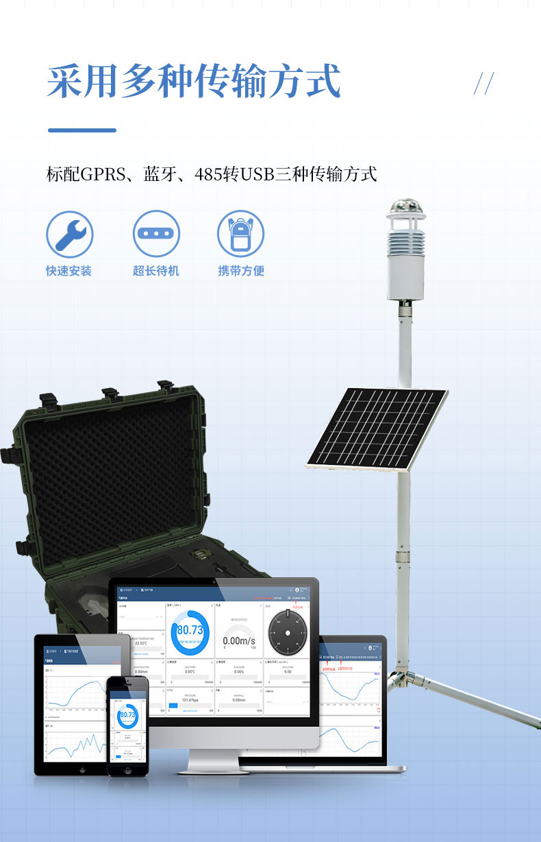 该设备支持有线、蓝牙、GPRS等传输方式,免调试,适用于各类应急气象短期观测、移动气象监测等气象数据的获取。广泛运用于气象、农林、环保、海洋、机场、港口、科学考察、校园教育等领域。