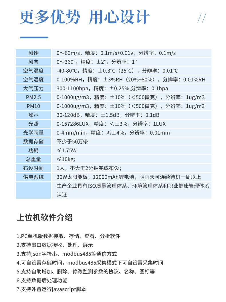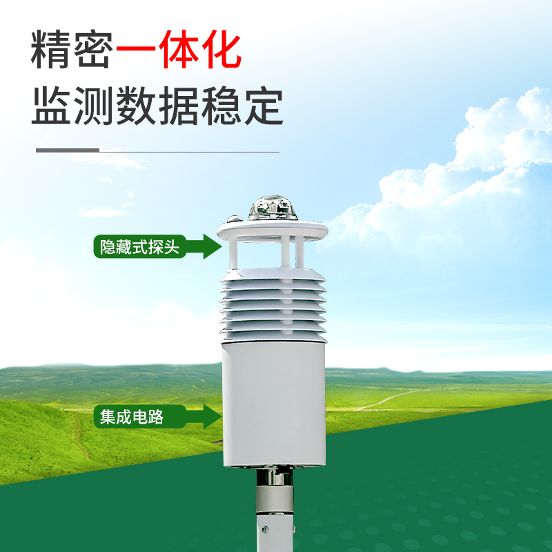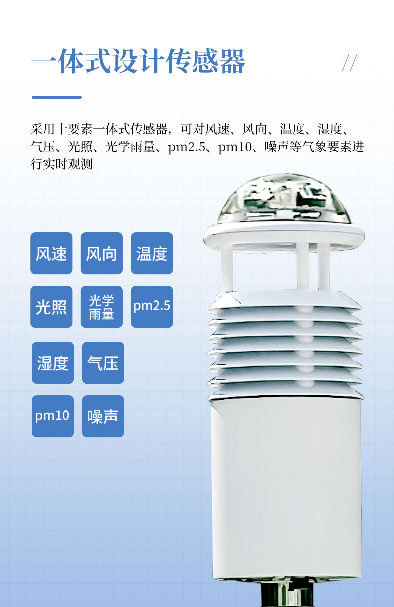 该设备采用十要素一体式传感器,可对风速、风向、温度、湿度、气压、光照、光学雨量、pm2.5、pm10、噪声等气象要素进行实时观测,传感器外壳采用进口ABS材质,能对抗盐雾等环境,防护等级达到IP65以上。