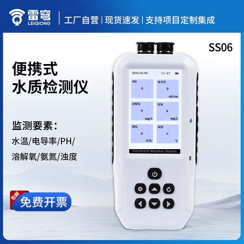 SS06型号水产养殖水质检测仪是一款电极法水质分析仪器,采用全数字电极检测,可检测水质水温、电导率、PH、氨氮、溶解氧、浊度参数。仪器搭载自研ftiot操作系统,操作简单、性能稳定、测量准确、检测范围广,内置高容量充电锂电池,便于用户在野外、实验室随时进行水质检测工作。