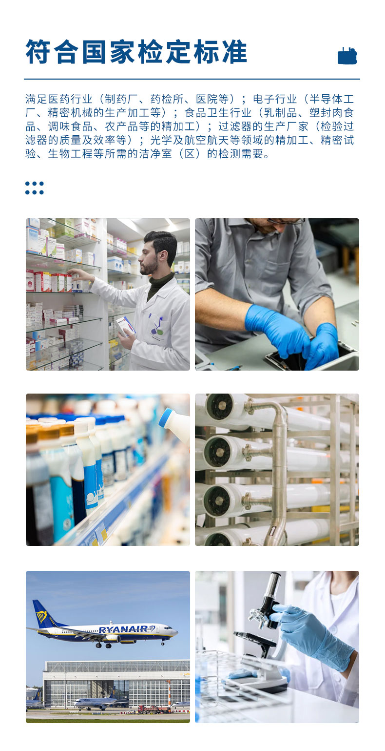 满足医药行业(制药厂、药检所、医院等);电子行业(半导体工厂、精密机械的生产加工等);食品卫生行业(乳制品、塑封肉食品、调味食品、农产品等的精加工);过滤器的生产厂家(检验过滤器的质量及效率等);光学及航空航天等领域的精加工、精密试验、生物工程等所需的洁净室(区)的检测需要。
