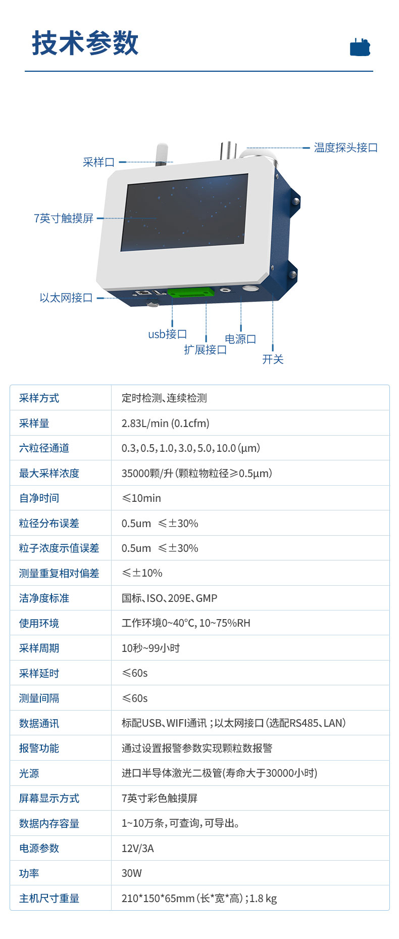 最大采样浓度:35000颗/升(颗粒物粒径≥0.5μm)