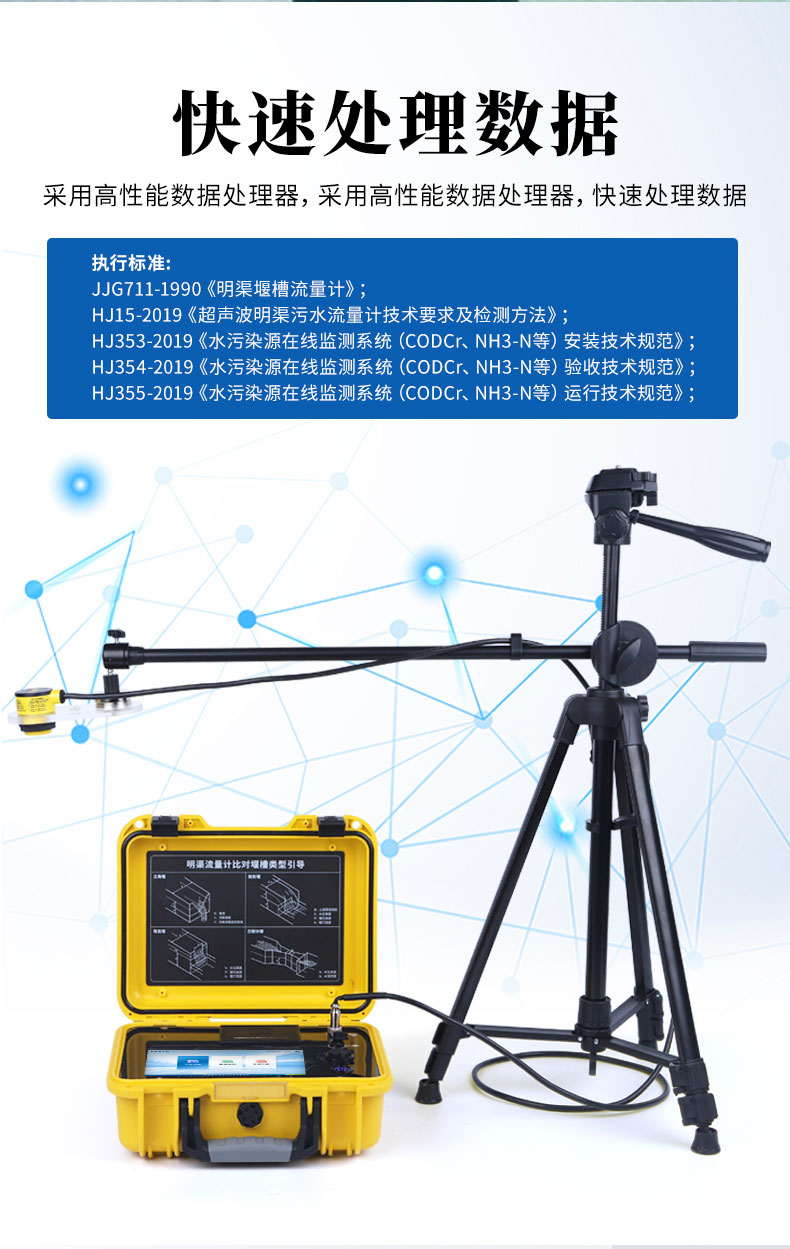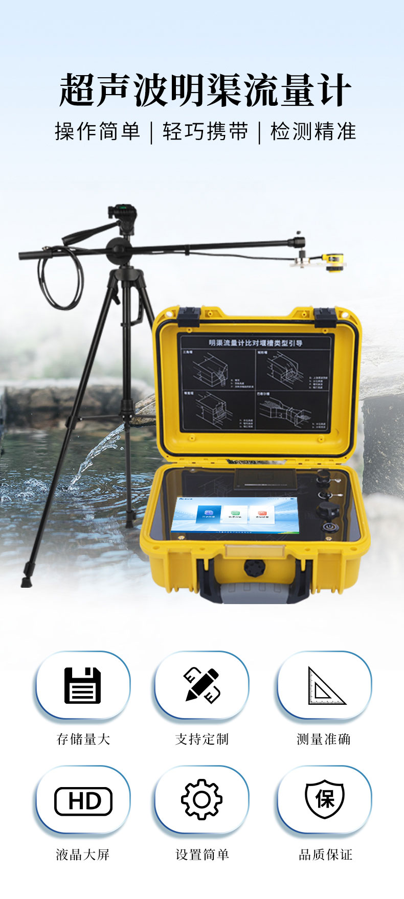 超声波明渠流量计是专为水文监测、江河流量监测、农业灌溉及市政给排水等行业设计的一种高精度测量仪表,它采用超声波技术和特殊的微功耗设计方案,结合全数字信号处理技术,确保了测量的稳定性与可靠性。该设备具有广泛的测量范围和较高的测量精度,支持实时数据显示、数据记录、导出及打印等功能,操作简便且准确度高,非常适合于需要频繁移动进行测量的场合。同时,它依据JJG711-1990检定规程,并参照HJ353-2019、HJ354-2019、HJ355-2019以及HJ15-2019中对流量监测单元的相关要求进行比对验收,确保了其在水利工程、环境监测、农业灌溉等领域的适用性和准确性。
