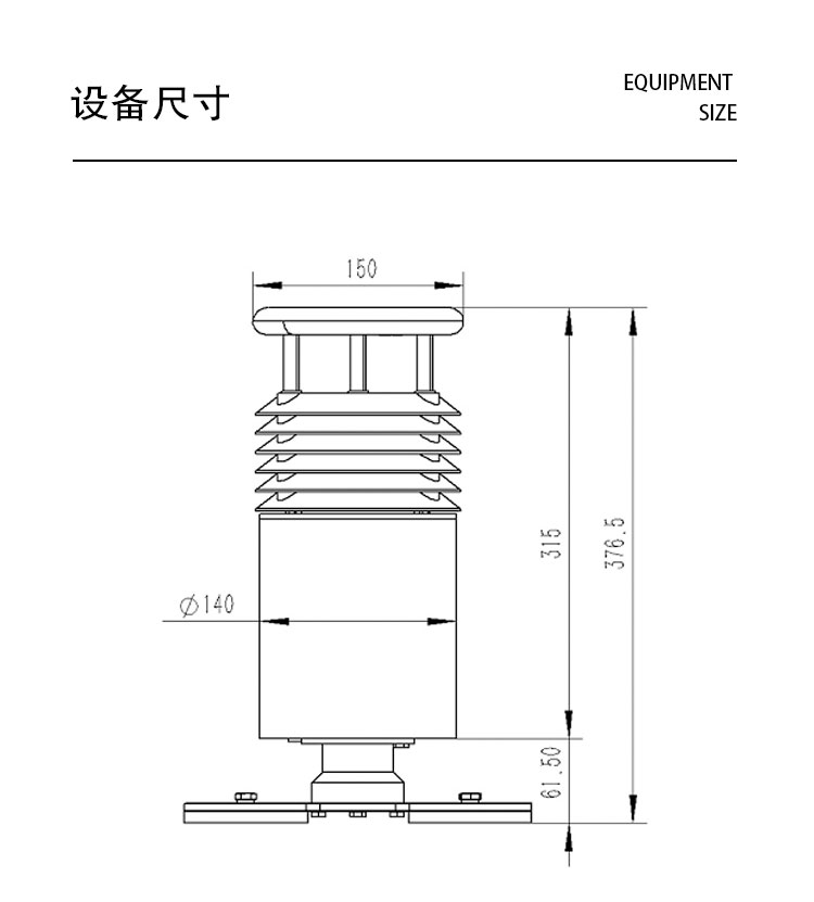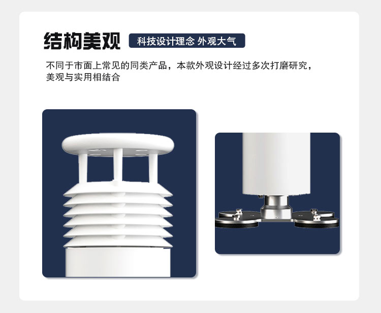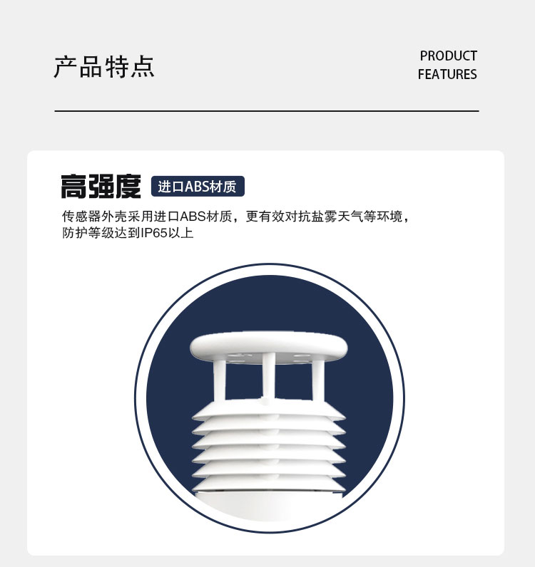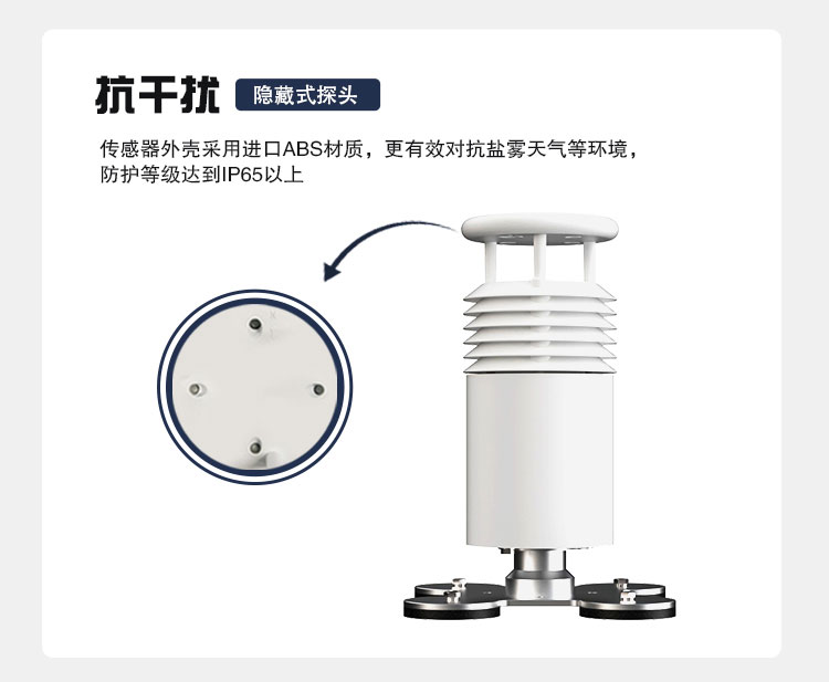 该设备采用五要素一体式传感器,可对风速、风向、空气温度、湿度、大气压力等气象要素进行实时观测,传感器外壳采用进口ABS材质,更有效对抗盐雾等环境,防护等级达到IP65以上。