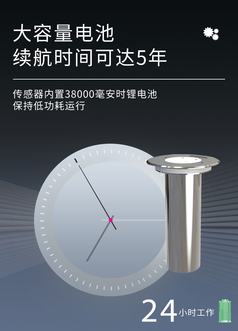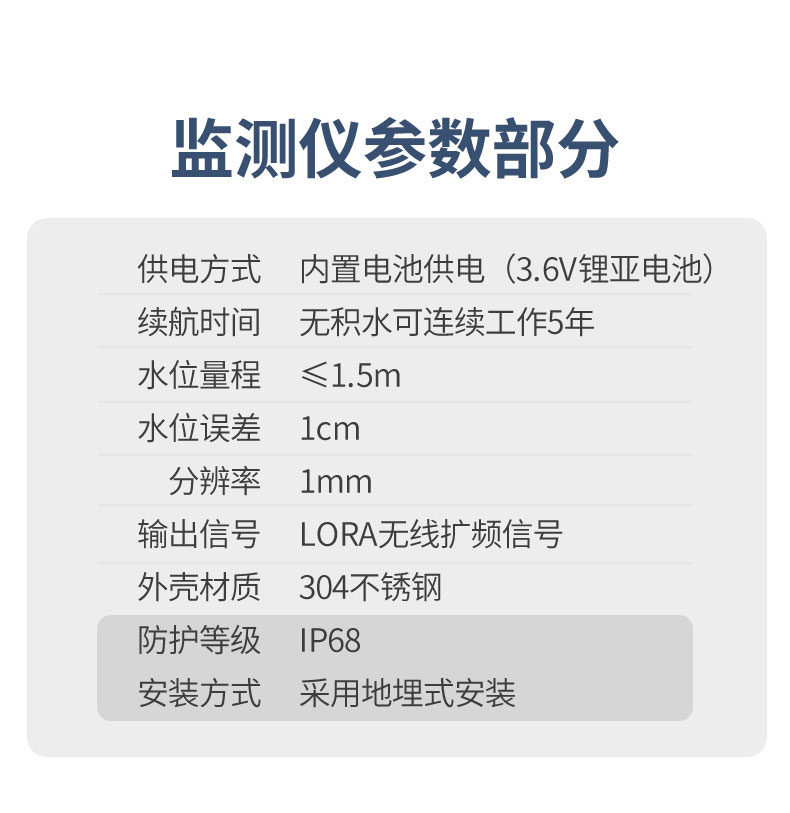 续航时间:无积水的情况下,可连续工作5年以上(无积水5min上传一条,积水1min上传一条)