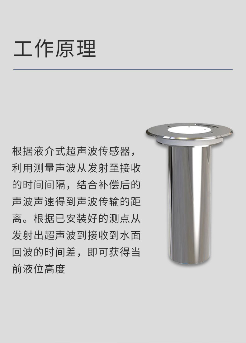 地埋式积水监测仪工作原理:根据液介式超声波传感器,利用测量声波从发射至接收的时间间隔,结合补偿后的声波声速得到声波传输的距离。根据已安装好的测点从发射出超声波到接收到水面回波的时间差,即可获得当前液位高度。