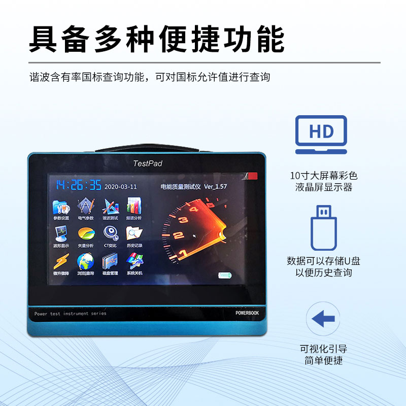 【产品简介】一、电能质量测试仪功能特点1、多通道测量:4个电压通道、4个电流通道同时测量。2、电气参数测量:可同时测量电压幅值、电流幅值、相位、频率、有功功率、无功功率、功率因数等数;3、可测···