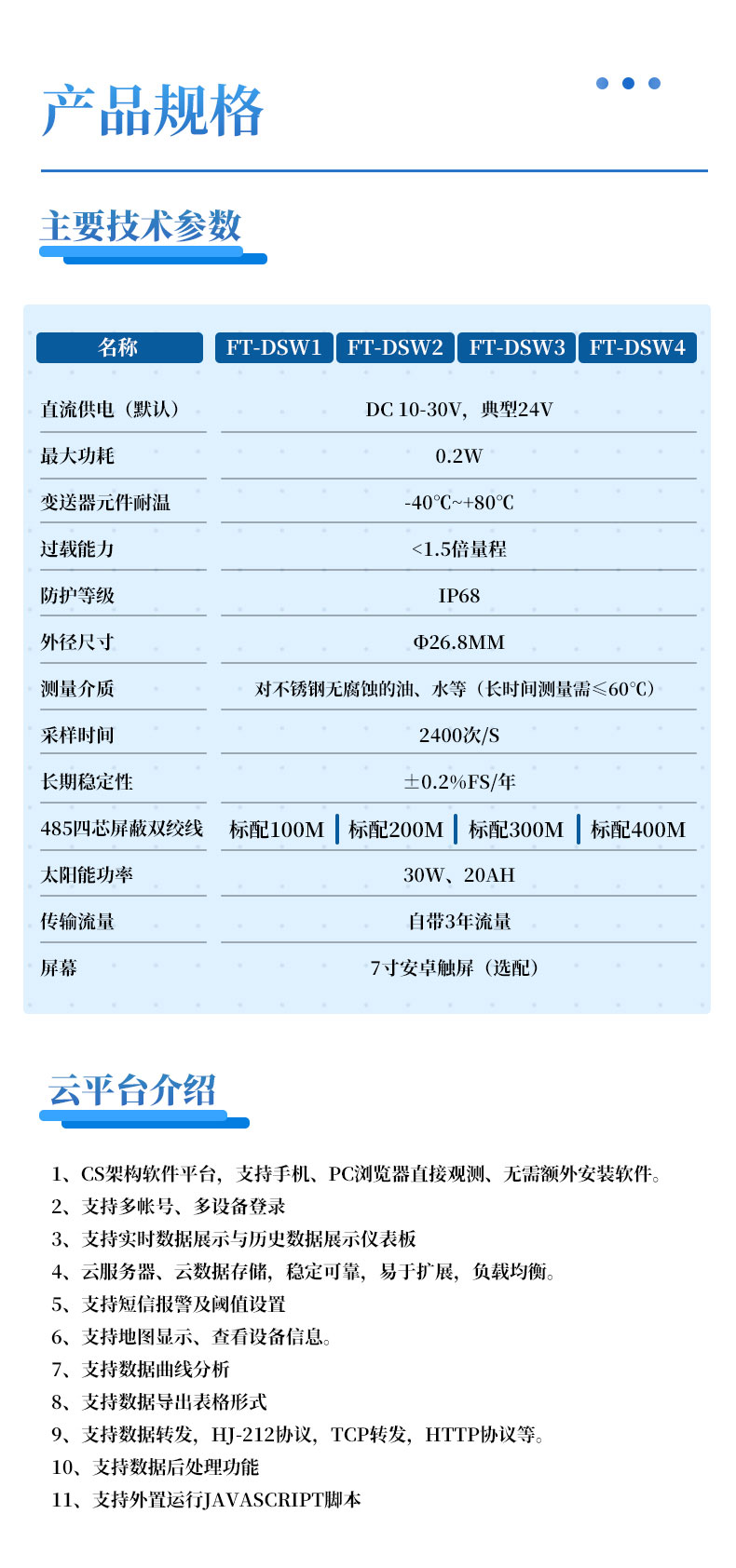 【产品简介】一、投入式水位监测设备产品简介DSW1投入式水位监测设备被广泛应用于地下水深井水位测量、矿山深井水位测量、地热井水位测量。其测量范围能够达到100米、200米、300米、400米,···