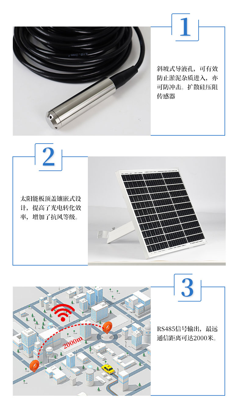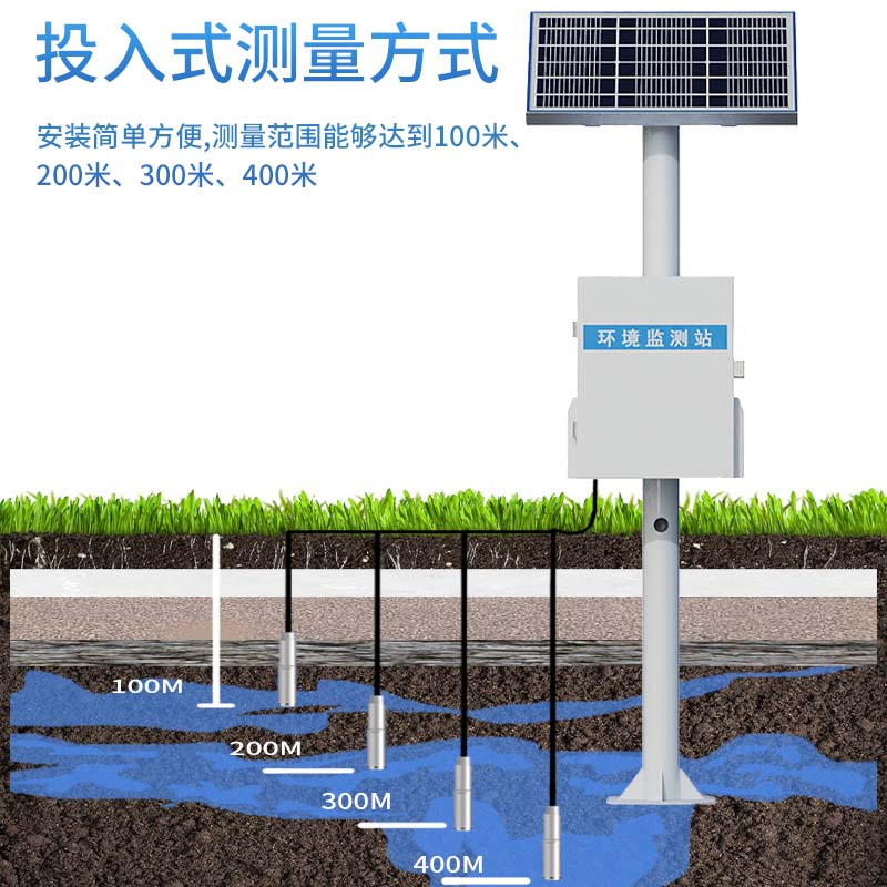 投入式水位监测设备根据压力与水深成正比的静水压力原理,运用水压敏感集成元器件做深井水位测量仪传感器探头,当传感器探头固定在水下某一测点时,该测点以上水柱压力高度加上该点的高程,即可间接测量出水位高低(水面到井口的距离);直接测量出的是传感器探头以上深井的液位实际高度。