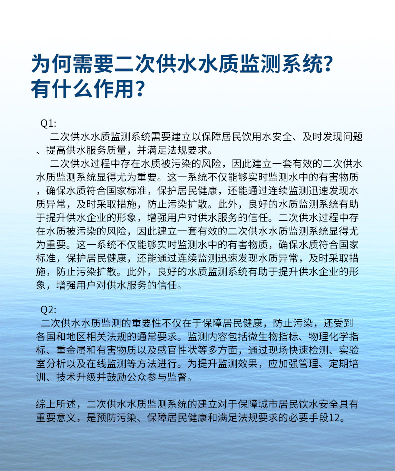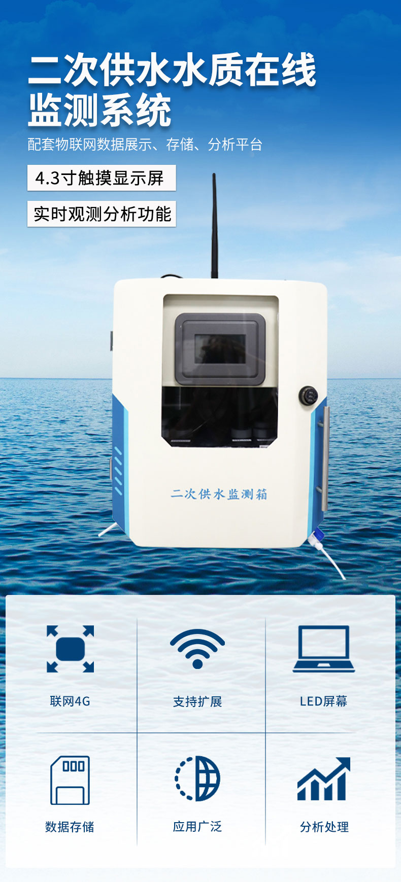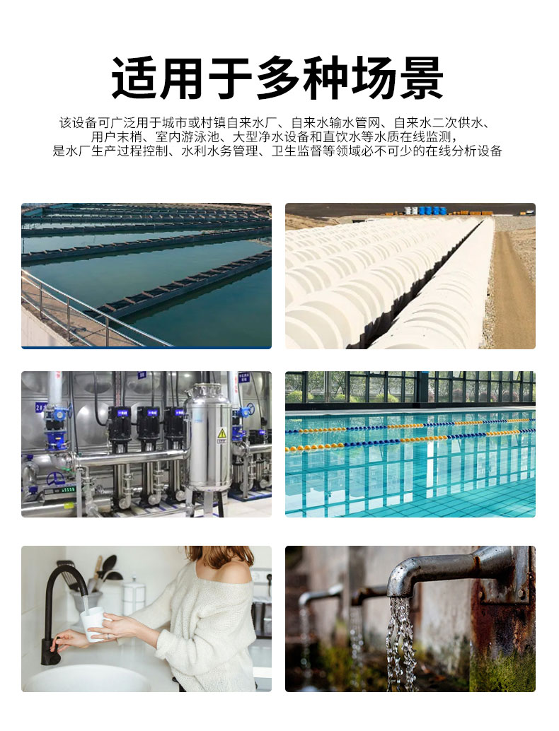 该设备用于供水末梢<0.3Mpa管压环境。可广泛应用城市或村镇自来水厂、自来水输水管网、自来水二次供水、用户末梢、室内游泳池、大型净水设备和直饮水等水质在线监测,是水厂生产过程控制、水利、水务管理、卫生监督等领域必不可少的在线分析设备。