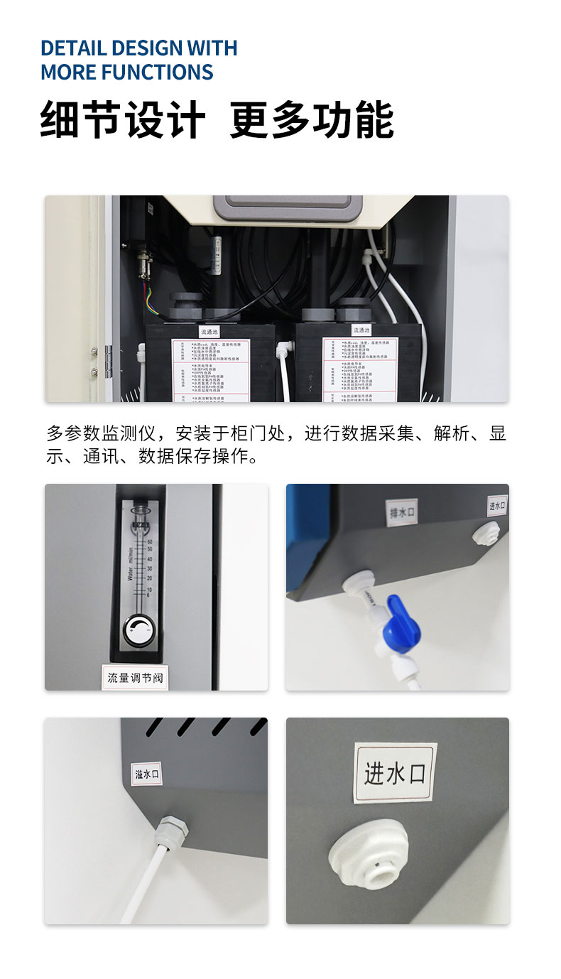供水水质监测微系统由供电单元、传感器数据监测单元、显示单元、流通池单元和远程通讯单元及集成箱主体单元组成。
