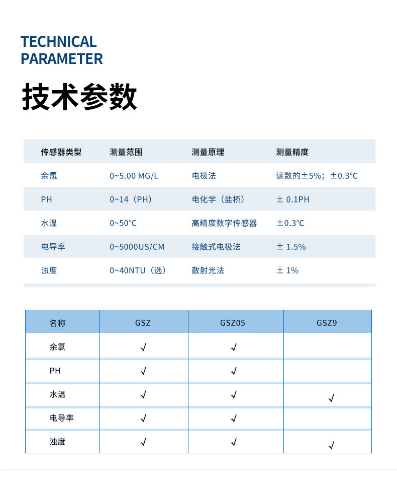 分析测试单元,主要由水温、浊度传感器构成,通过螺纹或紧配固定件固定于流通池上,传感器主要参数如下