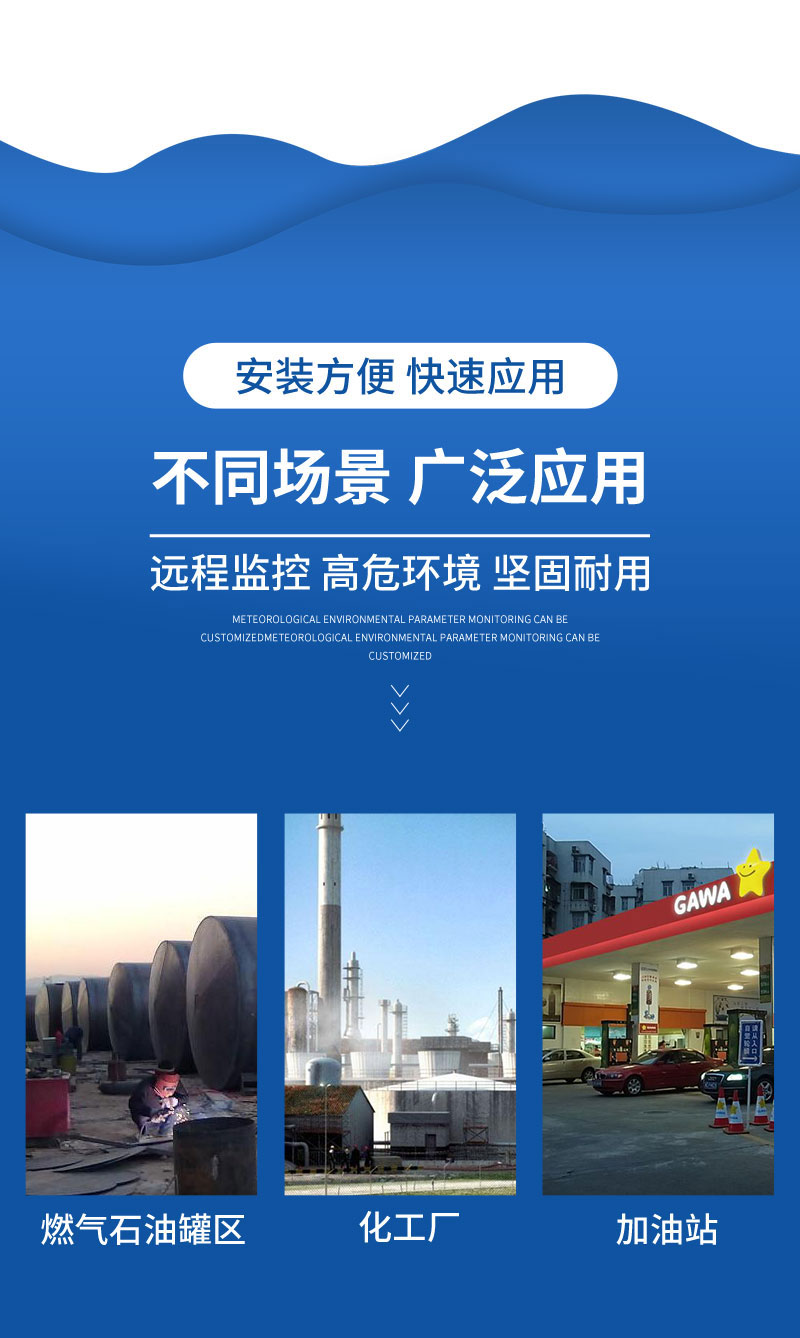 防爆型气象站采用了防腐、防爆、防水、防震、防尘等高防护等级的设计理念,可满足化工厂、油库、隧道、矿井等场景的使用需求。