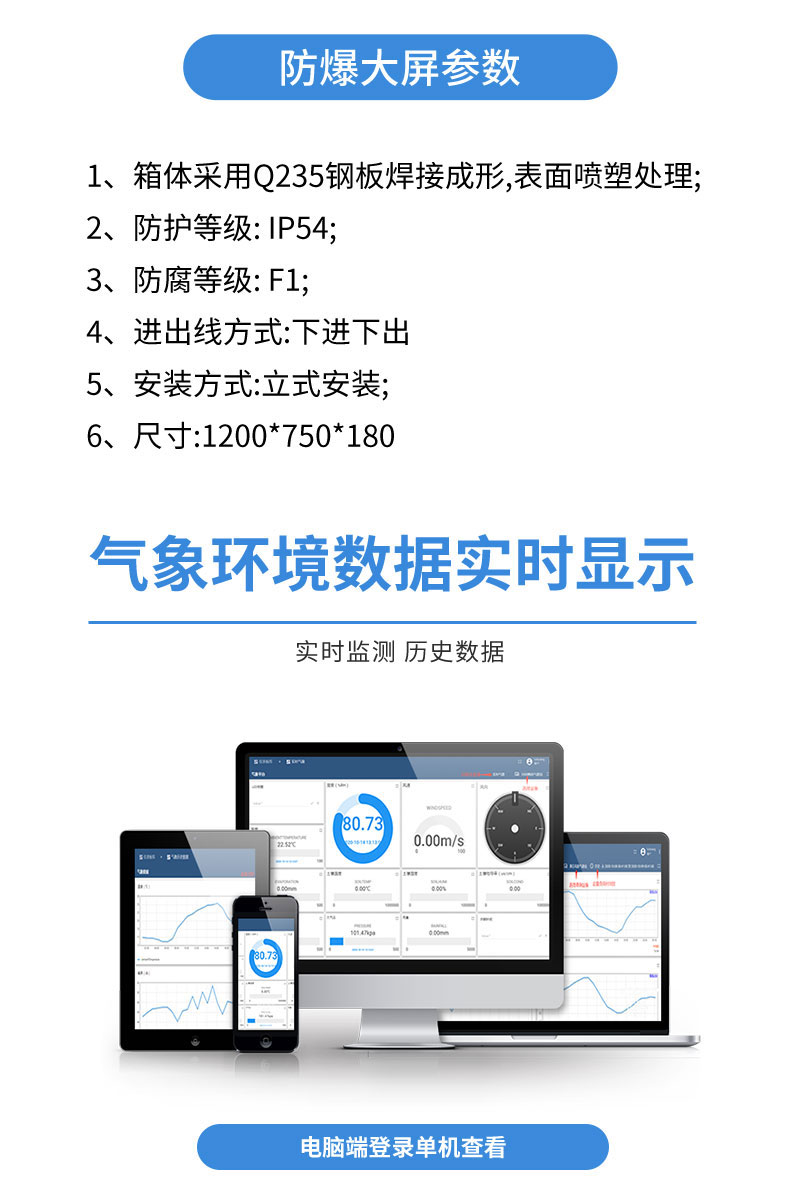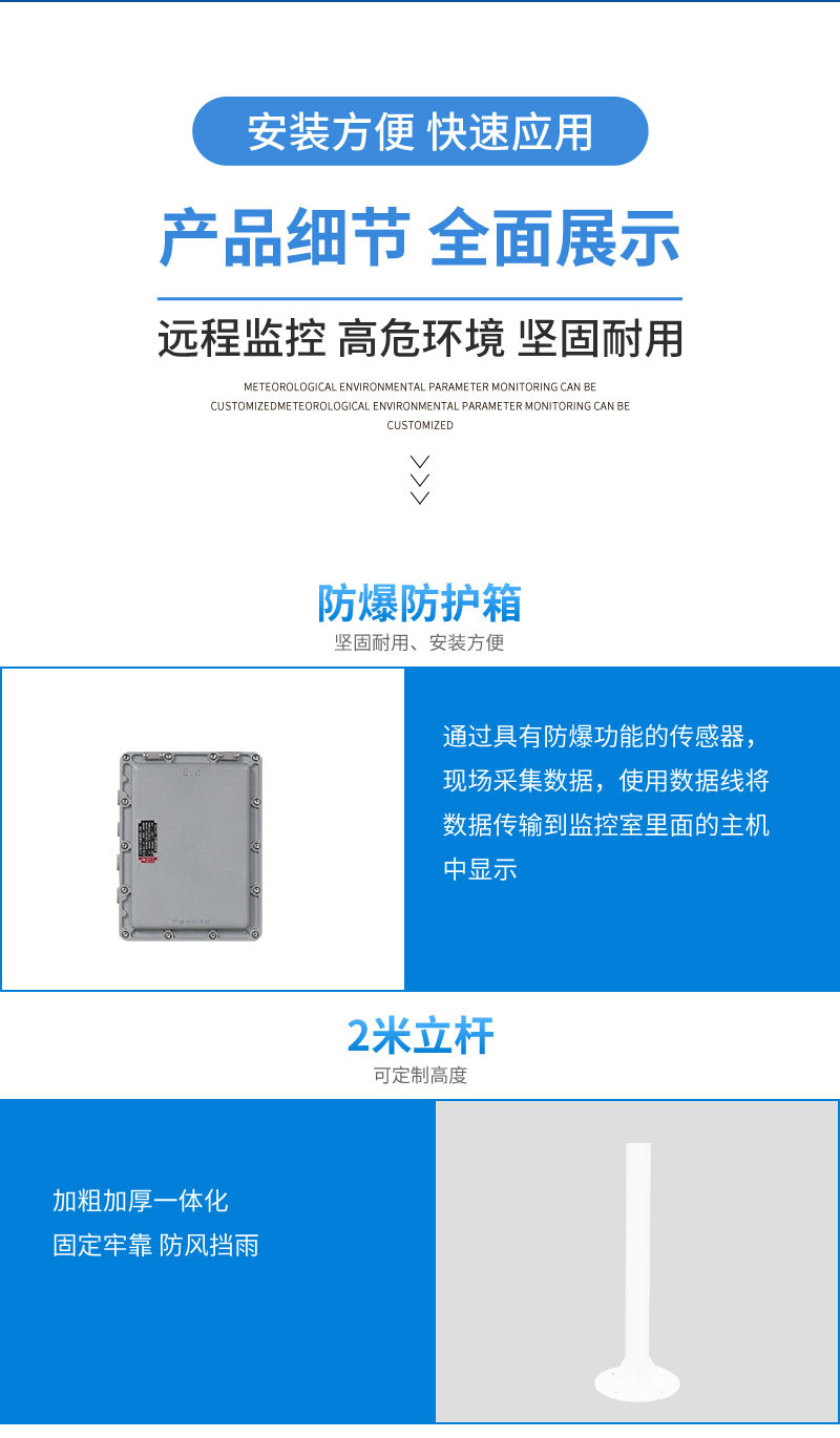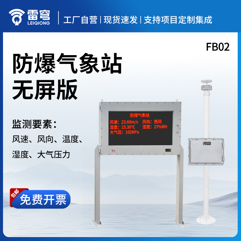 【产品简介】一、防爆型气象站产品简介防爆型气象站是山东雷穹根据市场需求,针对化工厂、油库等特殊场所而研发生产的一款一体化气象站。它集数据采集、存储、通讯、显示于一体,通过有线通讯方式直接在防爆···