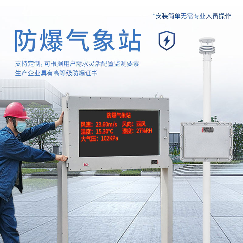防爆型气象站是山东雷穹根据市场需求,针对化工厂、油库等特殊场所而研发生产的一款一体化气象站。它集数据采集、存储、通讯、显示于一体,通过有线通讯方式直接在防爆屏幕实时显示数据。