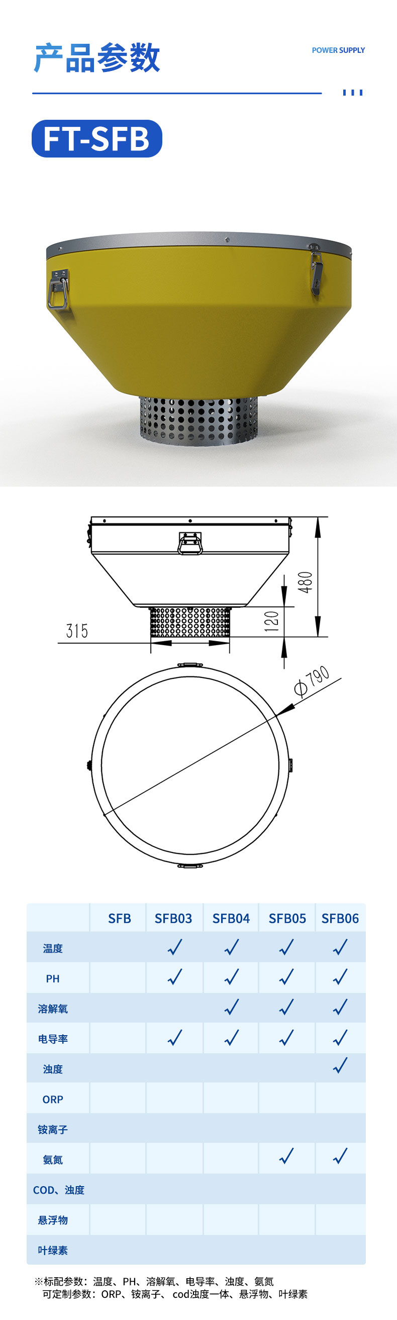 2.SFA06款浮标是由水质传感器(水温、电导率、PH、溶解氧、氨氮、浊度)、数据采集仪、通讯系统、供电系统、整体支架、水质监测平台六部分组成。同时可扩展COD、叶绿素、悬浮物等多项水质要素。数据采集仪具有数据采集、实时时钟、数据定时存储、参数设定和标准2G/4G(GPRS)通信功能。