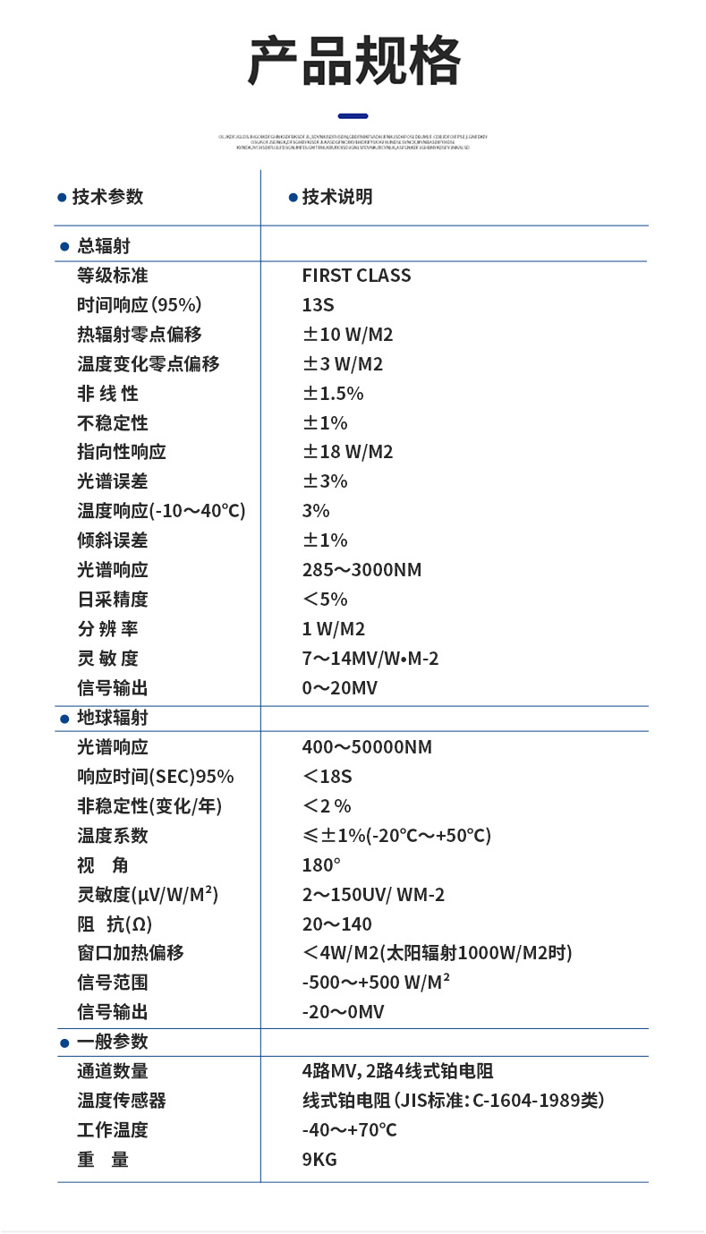 | 灵敏度(µV/W/m²) | 2~150uV/ Wm-2 |