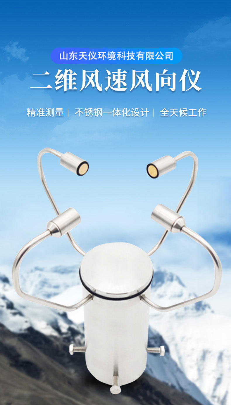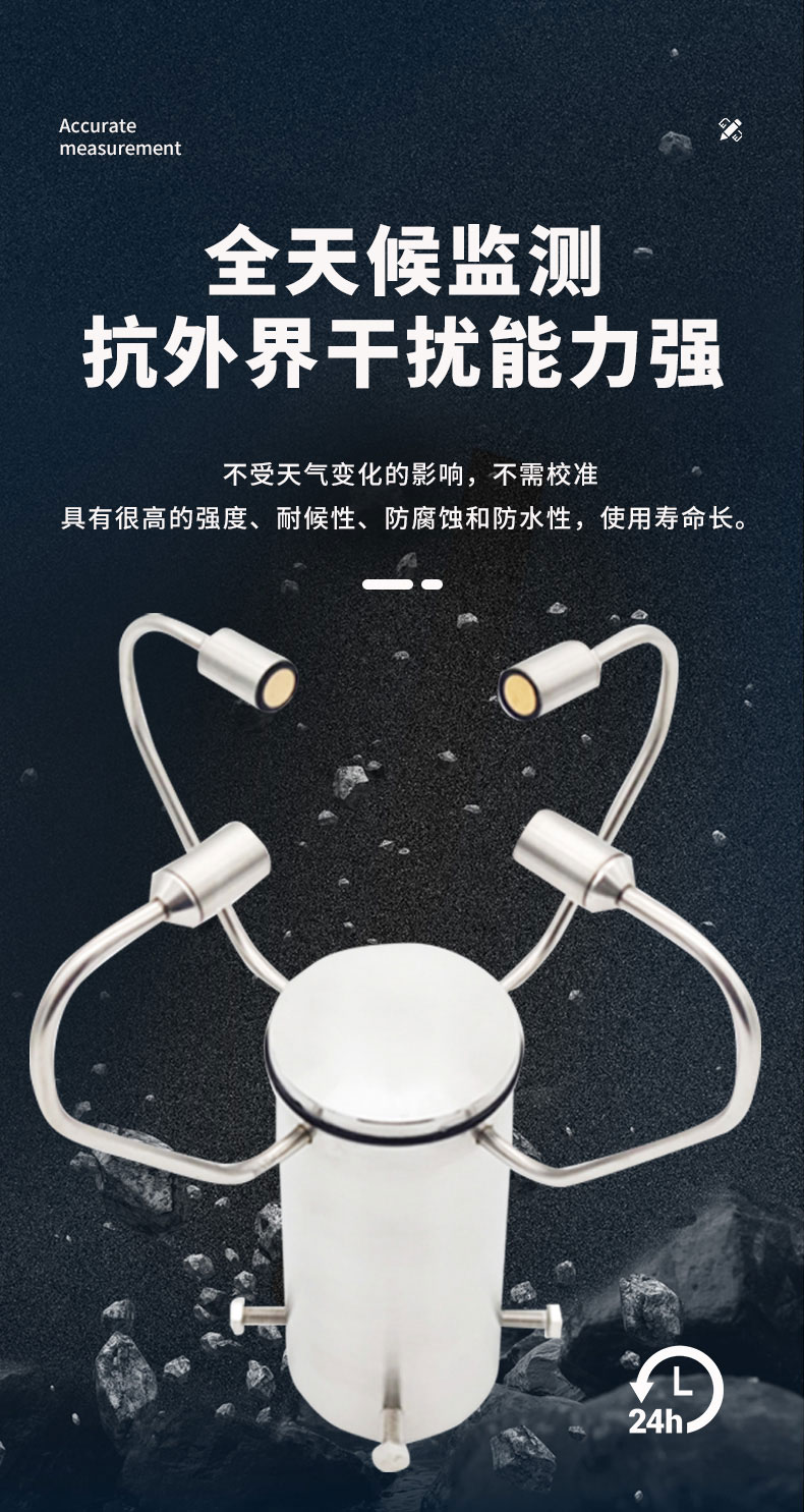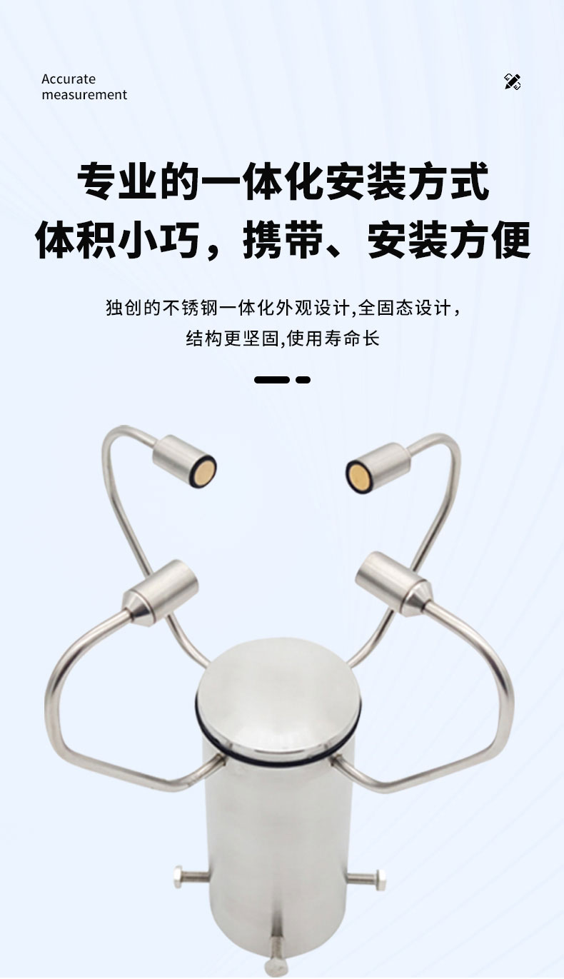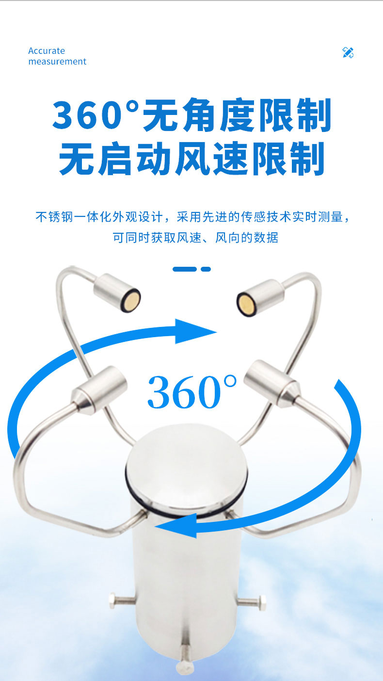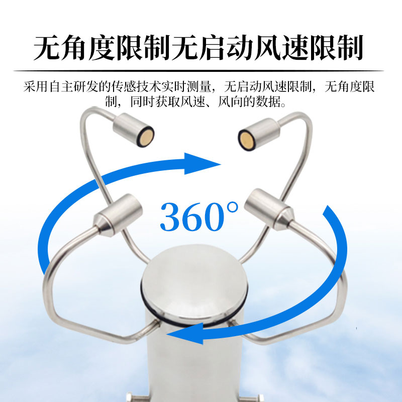 1.不锈钢一体化外观设计,外观精美,采用自主研发的传感技术实时测量,无启动风速限制,无角度限制,同时获取风速、风向的数据。