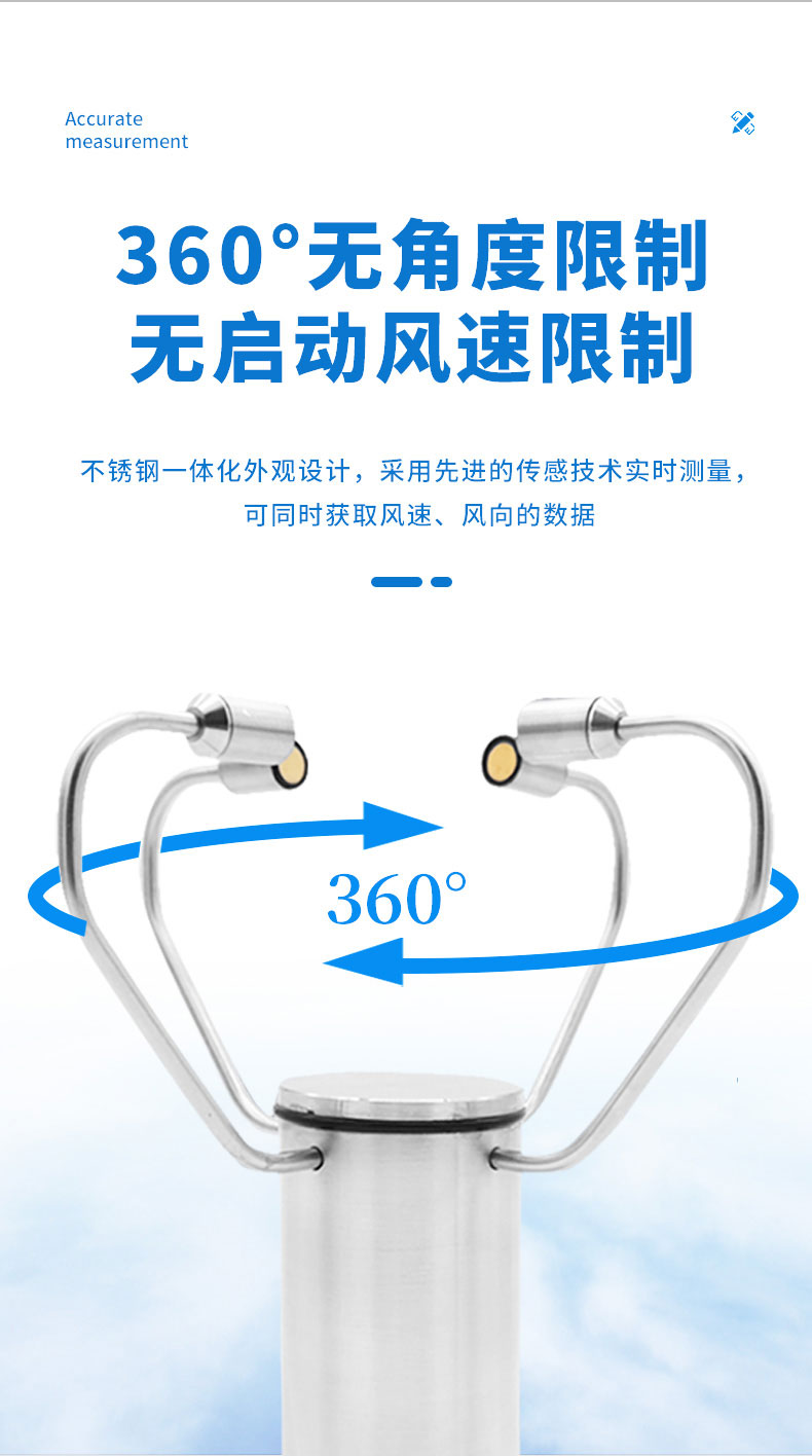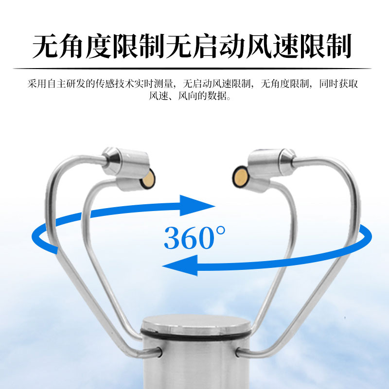 1.不锈钢一体化外观设计,外观精美,采用自主研发的传感技术实时测量,无启动风速限制,无角度限制,同时获取风速、风向的数据。