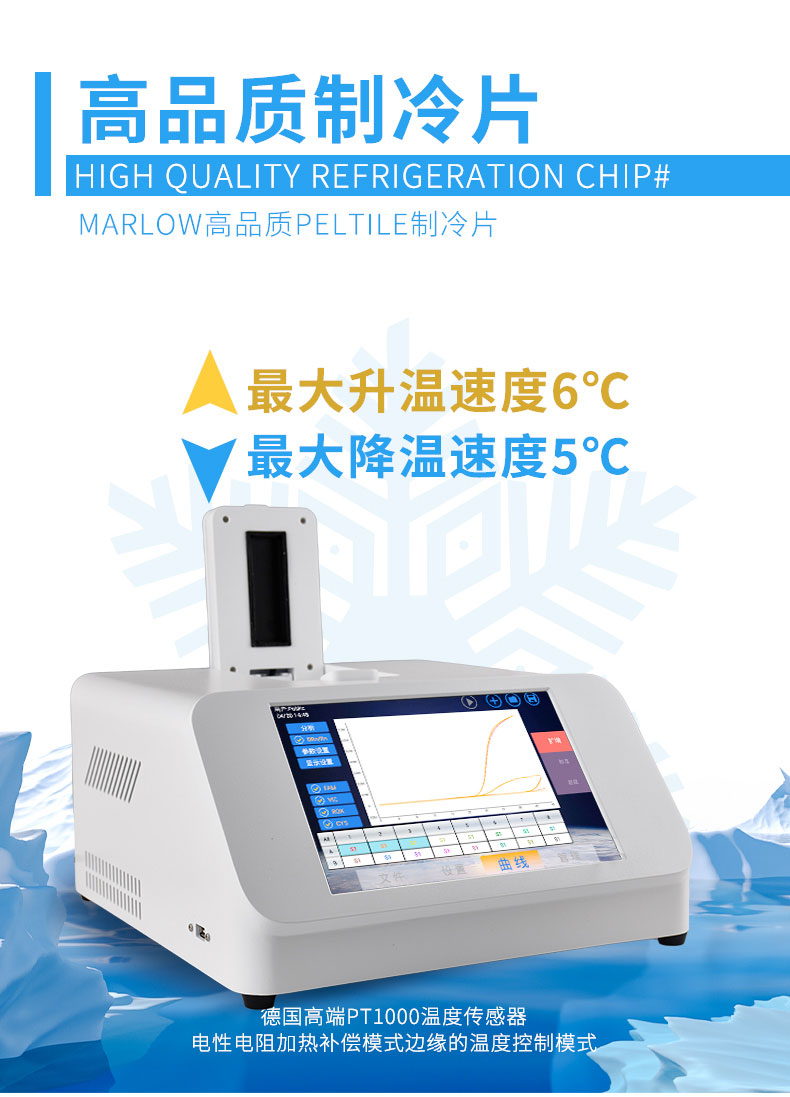 3.Marlow高品质Peltier制冷片,结合德国高端PT1000温度传感器以及电性电阻加热补偿边缘的温度控制模式,最大升温速度7℃,最大降温速度5℃,大大缩短实验时间。