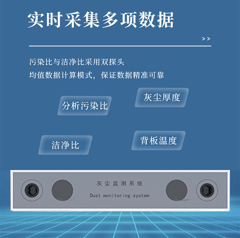 设备描述:光伏电站灰尘监测系统是一种用于监测光伏板表面灰尘覆盖情况的设备,主要用于提高光伏发电效率和维护光伏系统,主要功能和产品特点使其成为光伏发电系统中重要的辅助设备,帮助用户及时清洁光伏板,提高发电效率,延长光伏系统的使用寿命。