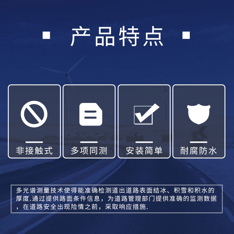 在埋入式路面传感器不便或不能安装的路面条件下,遥感安装,意味着不需要封闭道路、不需要切割路面,安装工作既安全又方便。维护量少,是道路气象系统组成中一项理想选择。