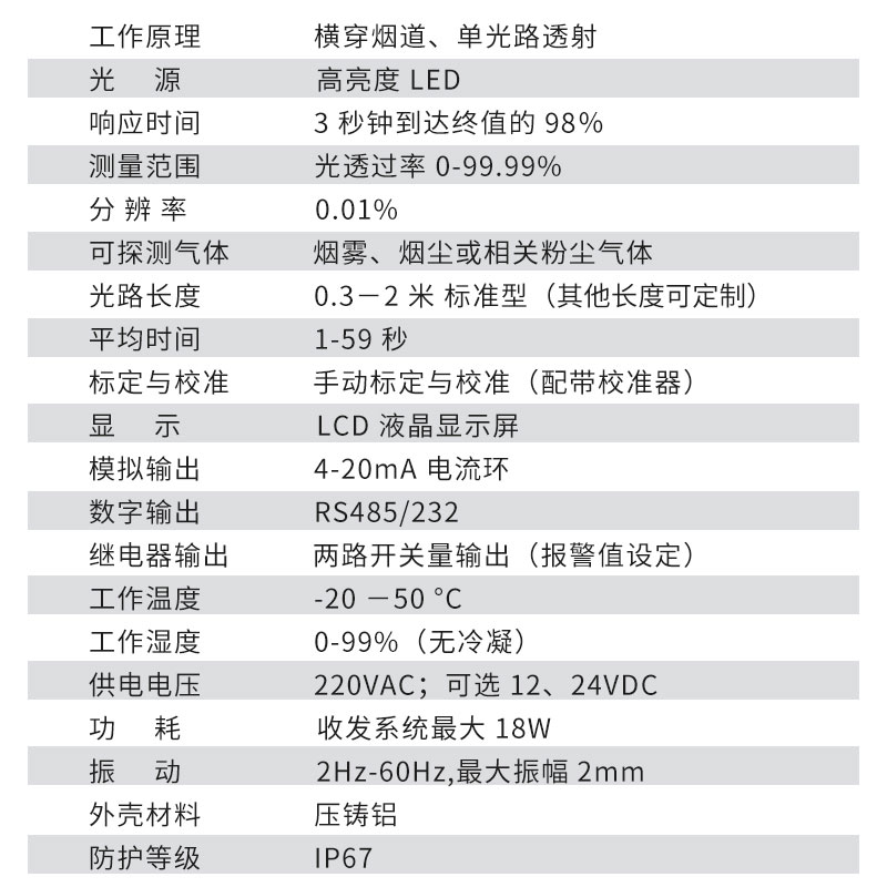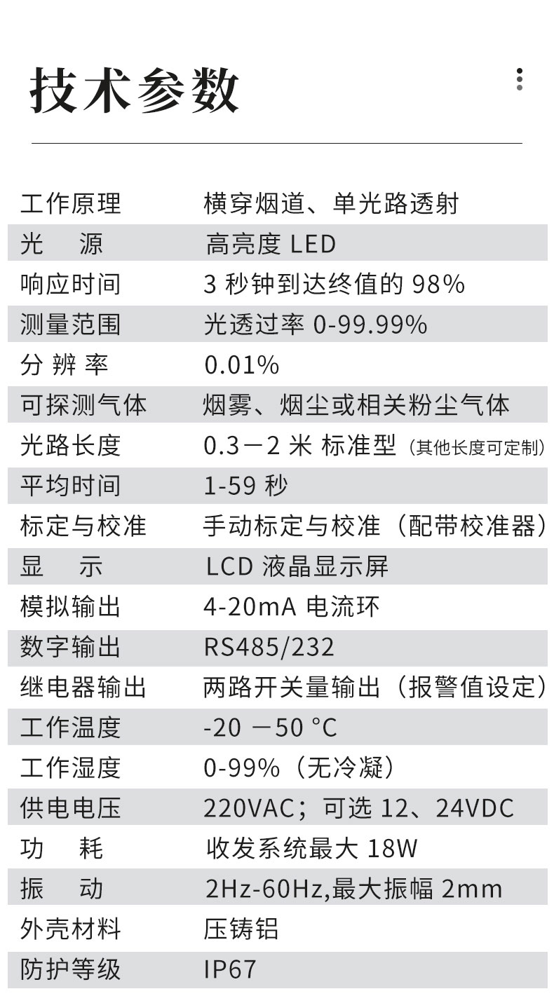 三、烟道粉尘透过率检测仪技术参数
