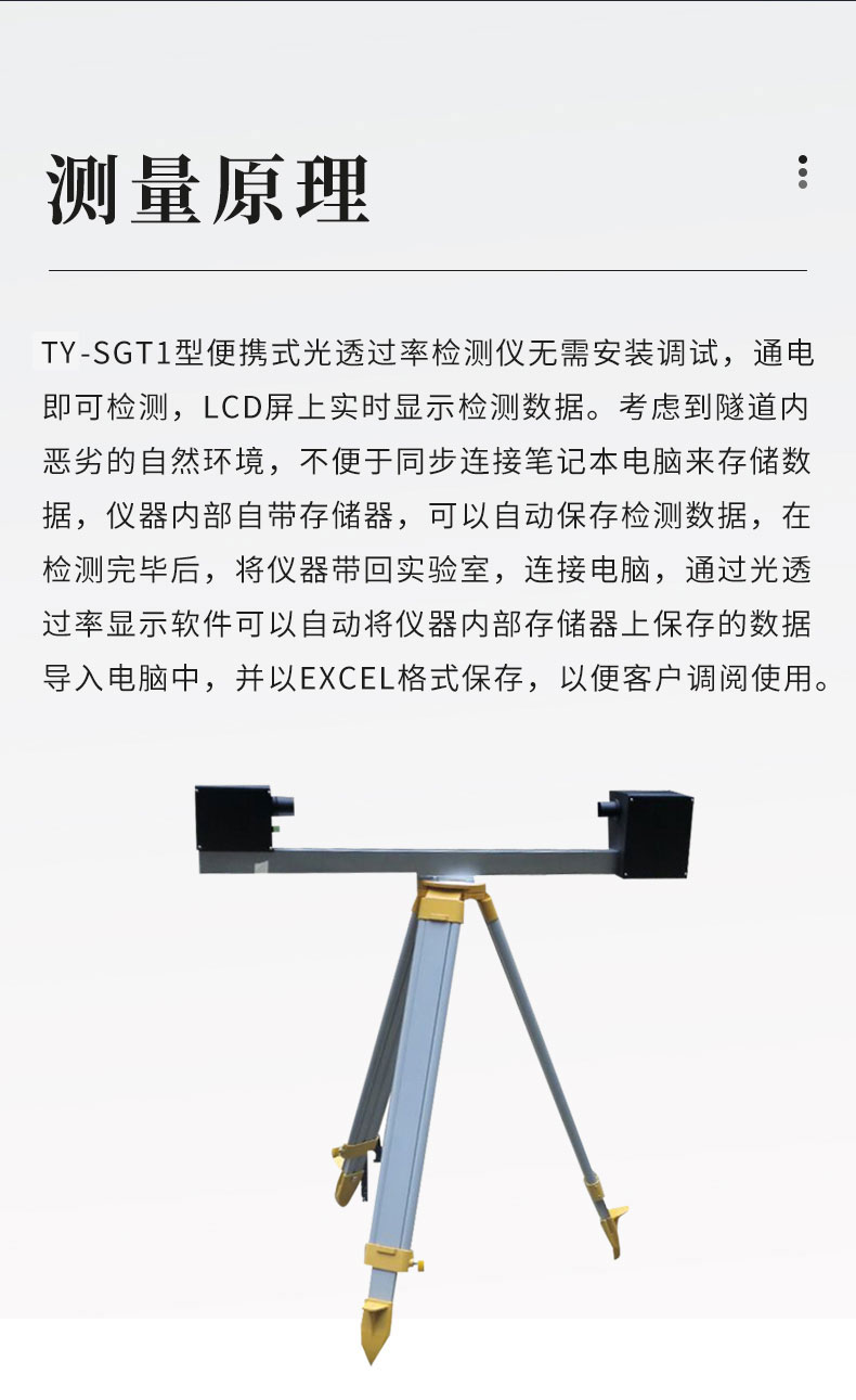 便携式光透过率检测仪无需安装调试,通电即可检测,LCD屏上实时显示检测数据。考虑到隧道内恶劣的自然环境,不便于同步连接笔记本电脑来存储数据,仪器内部自带存储器,可以自动保存检测数据,在检测完毕后,将仪器带回实验室,连接电脑,通过光透过率显示软件可以自动将仪器内部存储器上保存的数据导入电脑中,并以EXCEL格式保存,以便客户调阅使用。