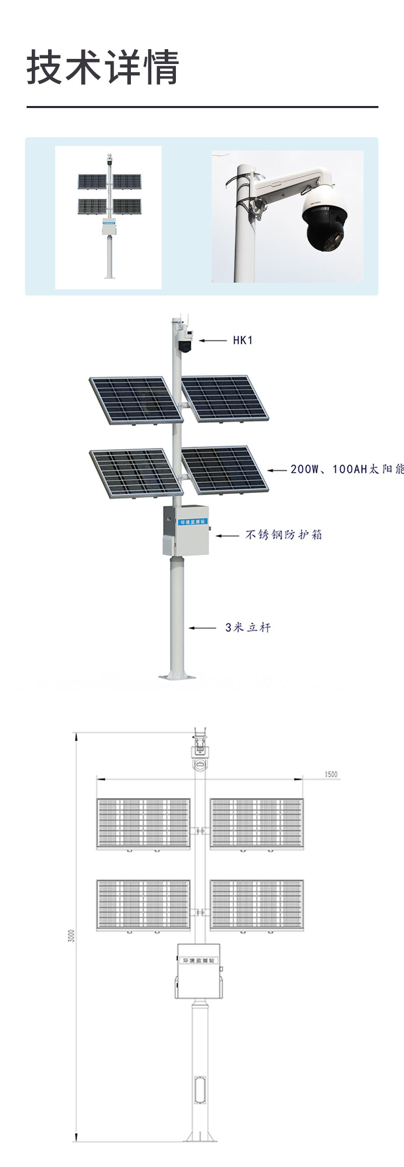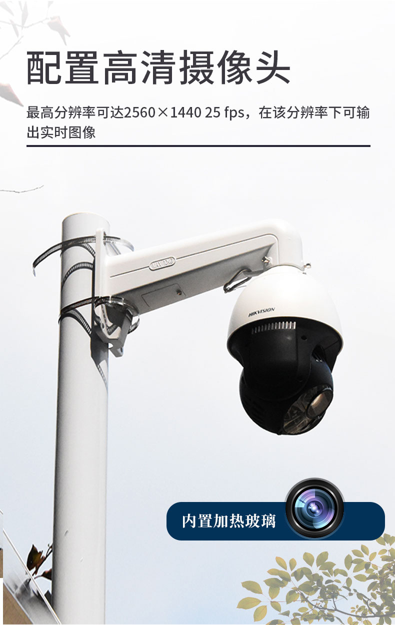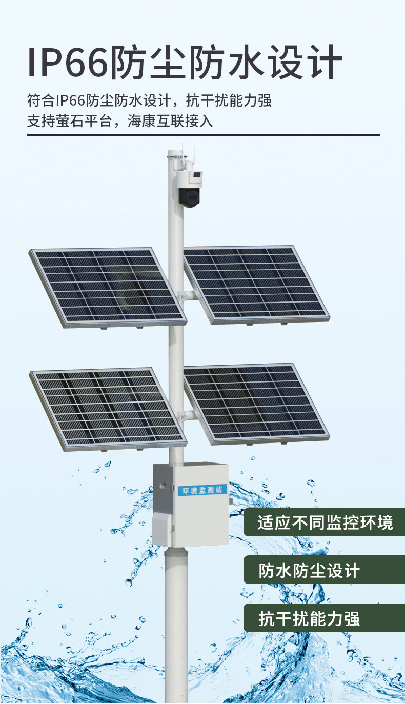 该系统由三米碳钢支架、HK1海康摄像头、太阳能供电系统(含防护箱)、云平台组成