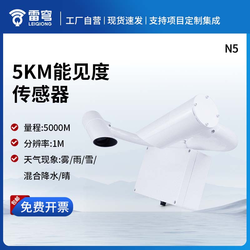 N5型5KM能见度传感器采用前向散射法测量空气总消光系数,进而计算当前能见度,广泛用于道路交通、气象等行业。