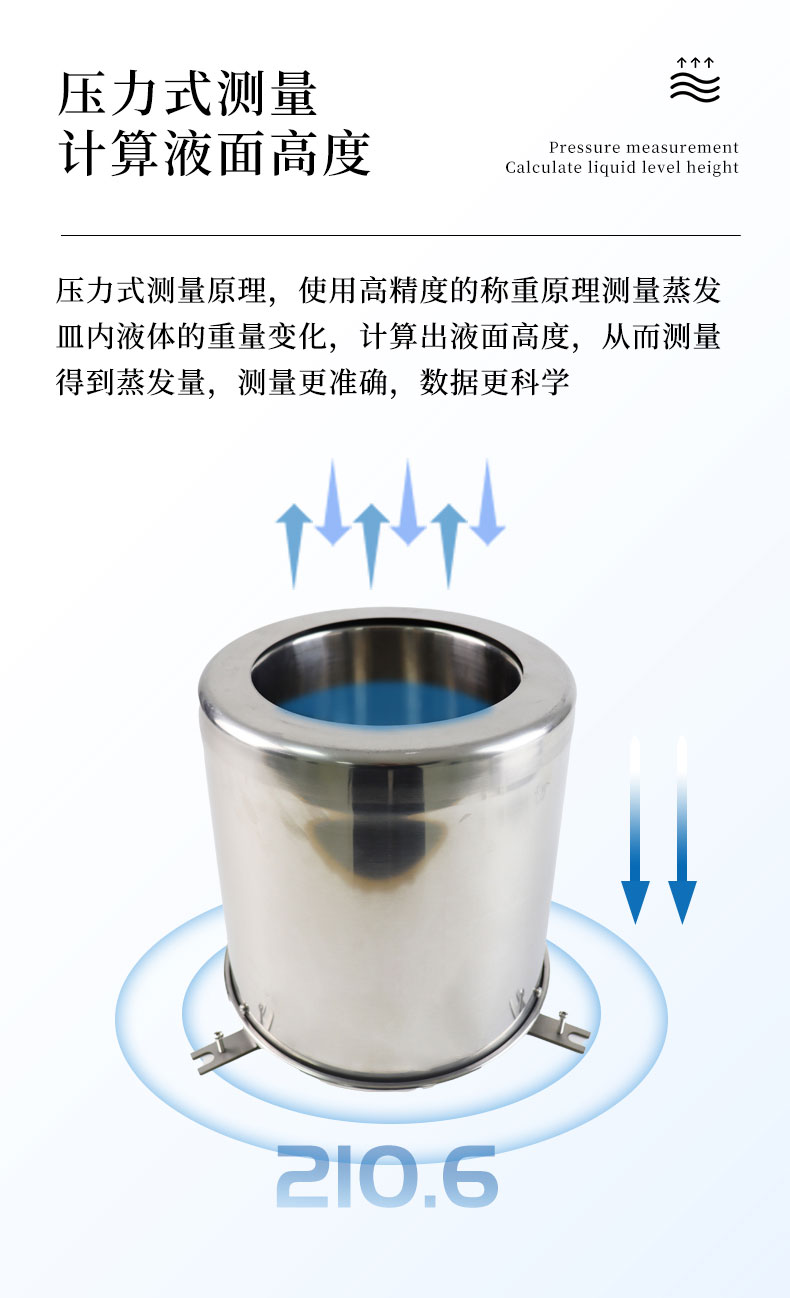 3.压力式测量原理,使用高精度的称重原理测量蒸发皿内液体的重量变化,计算出液面高度,从而测量得到蒸发量,测量更准确,数据更科学;