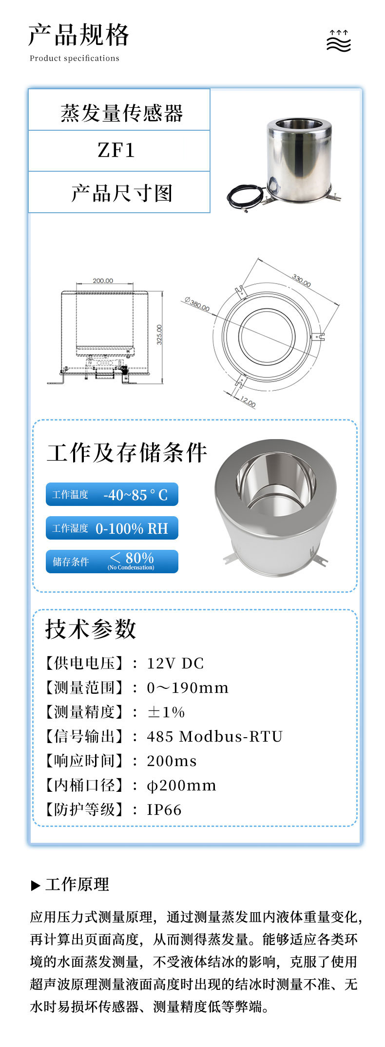 【产品简介】一、蒸发量传感器工作原理应用压力式测量原理,通过测量蒸发皿内液体重量变化,再计算出页面高度,从而测得蒸发量。能够适应各类环境的水面蒸发测量,不受液体结冰的影响,克服了使用超声波原理···