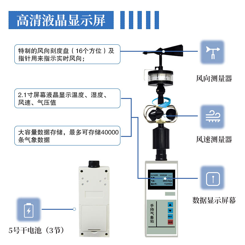 手持式风速风向仪是一款携带方便,操作简单,集多项气象要素于一体的可移动式气象观测仪器。系统采用精密传感器及智能芯片,能同时对风向、风速两项气象要素进行准确测量。内置大容量FLASH存储芯片可存储至少一年的气象数据;通用USB通讯接口,接入U盘导出数据,方便用户对气象数据的进一步处理分析。