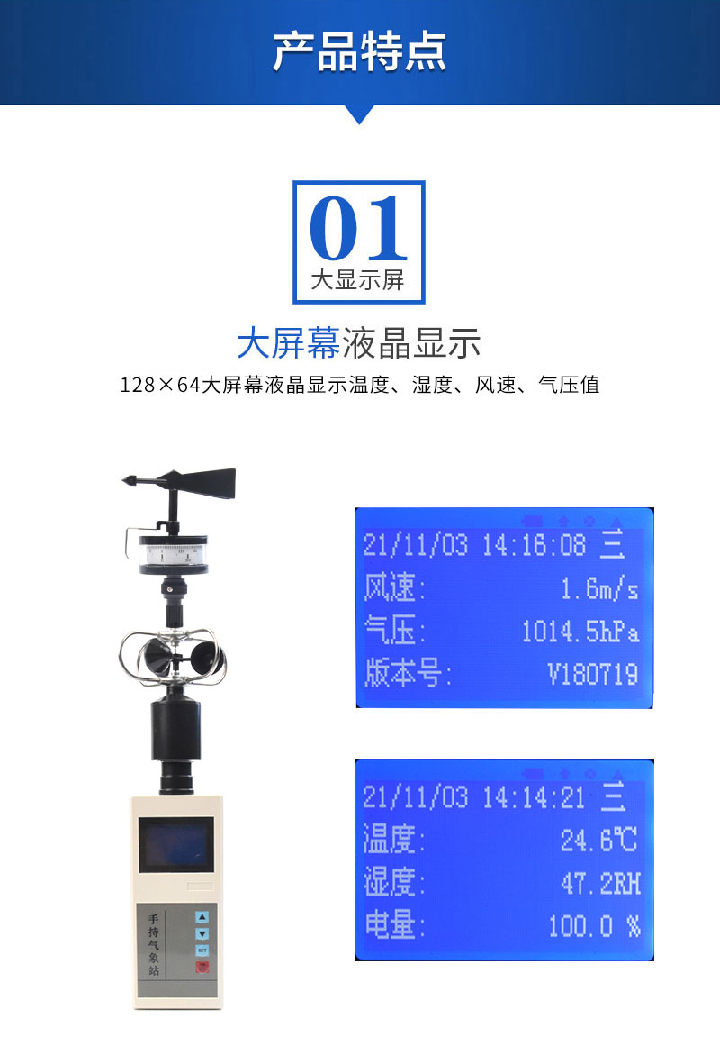 2.1寸屏幕液晶显示温度、湿度、风速、气压值;