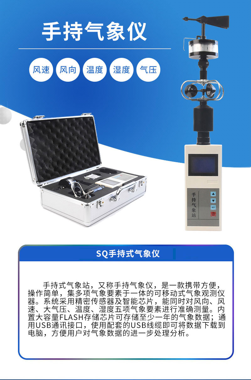 【产品简介】一、电子气象仪产品简介电子气象仪是一款携带方便,操作简单,集多项气象要素于一体的可移动式气象观测仪器。系统采用精密传感器及智能芯片,能同时对风向、风速、大气压、温度、湿度五项气象要···