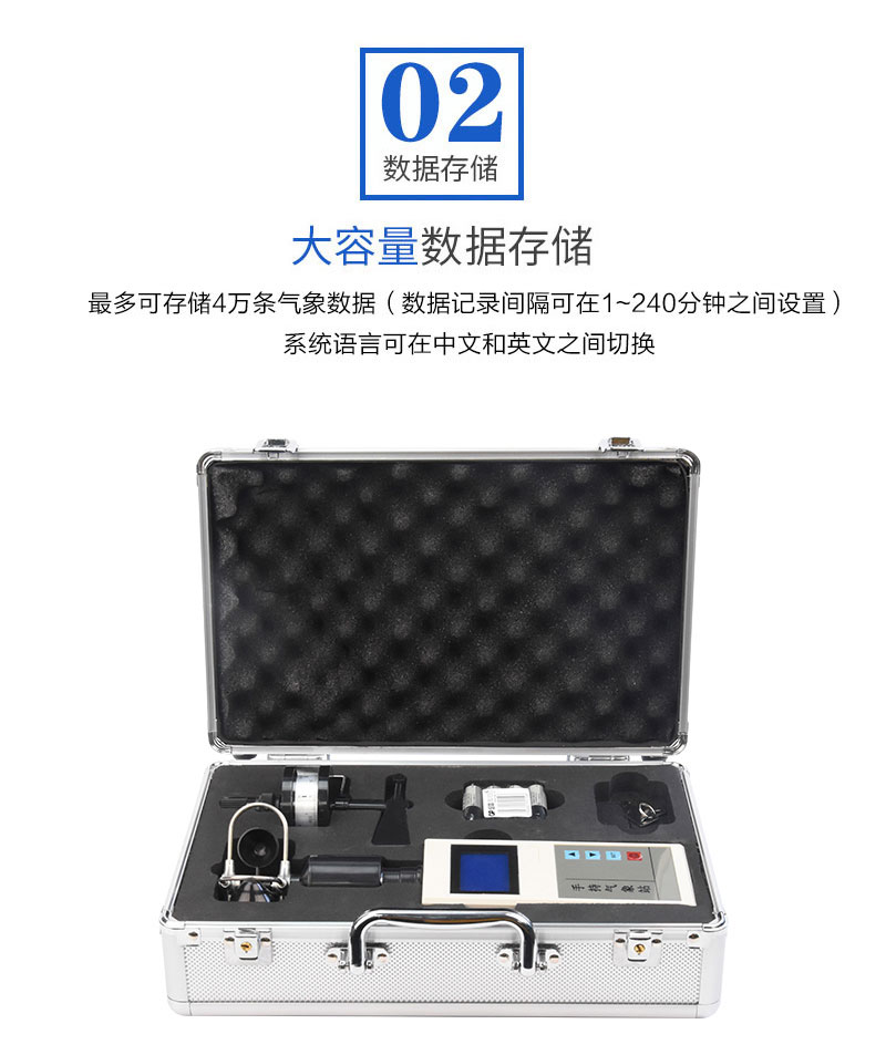大容量数据存储,最多可存储40000条气象数据(数据记录间隔可在1~60分钟之间设置);
