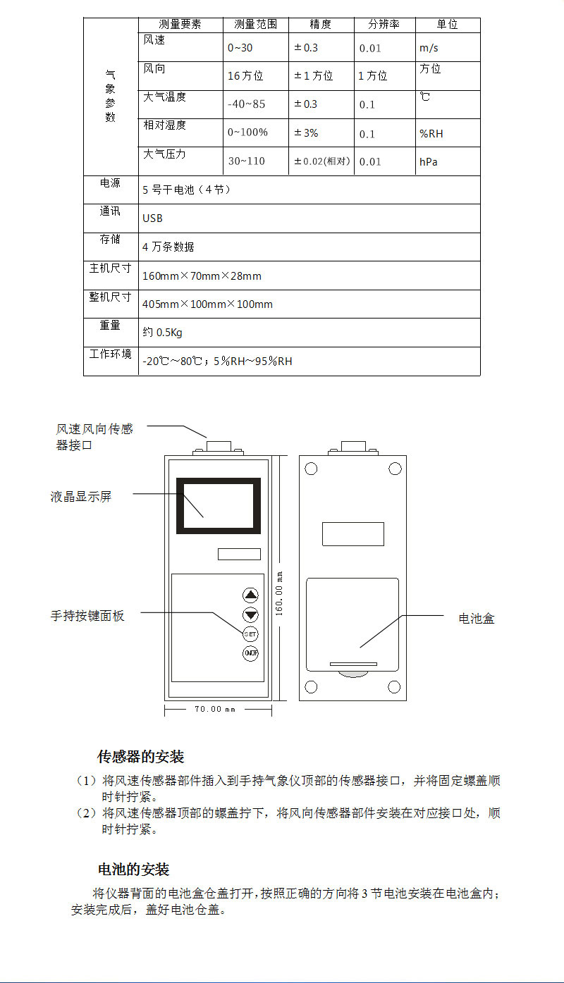 | 风速 | 0~30 | ±0.3 | 0.01 | m/s | |