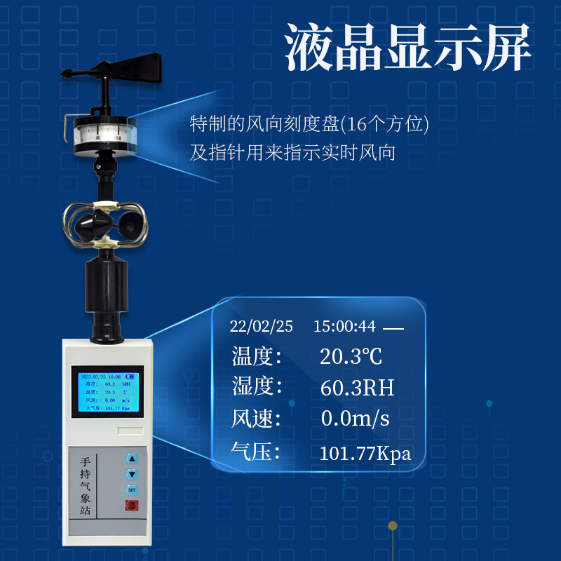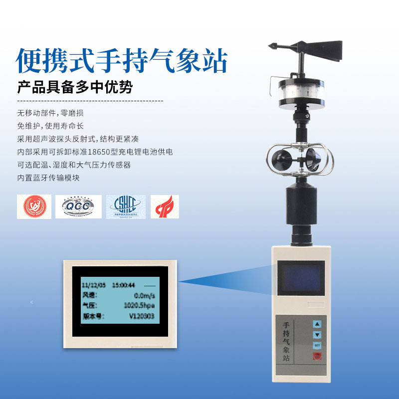 电子气象仪是一款携带方便,操作简单,集多项气象要素于一体的可移动式气象观测仪器。系统采用精密传感器及智能芯片,能同时对风向、风速、大气压、温度、湿度五项气象要素进行准确测量。内置大容量FLASH存储芯片可存储至少一年的气象数据;通用USB通讯接口,接入U盘导出数据,方便用户对气象数据的进一步处理分析。