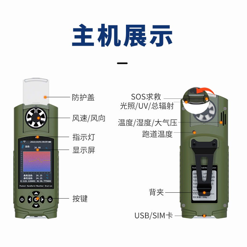 【产品简介】一、袖珍手持气象仪产品简介本产品提供温度、湿度、大气压、风速、风向、光照、总辐射、紫外辐射、跑道温度等参数的实时测量。并具备户外的SOS求救、电子罗盘、跑道温度、未来3小时天气预报···