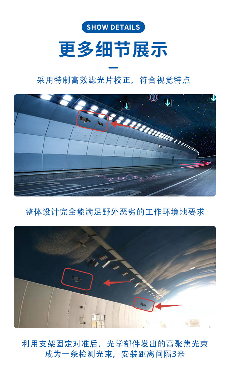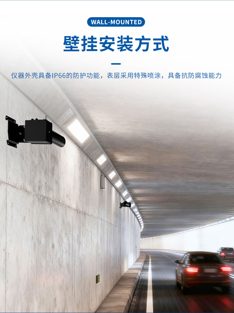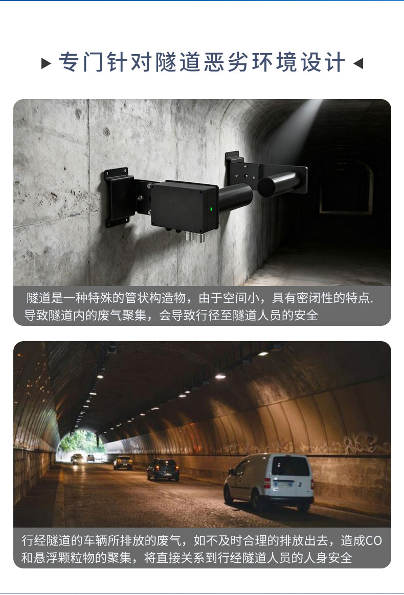 该智能检测仪内部自带补偿功能,在光学镜头在被污染情况,能自动进行增益补偿,从而保证了较长的维护周期。隧道是一种特殊的管状构造物,由于空间小,具有密闭性的特点,行经隧道的车辆所排放的废气,如不及时合理的排放出去,造成CO和悬浮颗粒物的聚集以及氮氧化物(NOX)等有毒气体超标,将直接关系到行经隧道的车辆司乘人员和维护工作人员的人身安全。