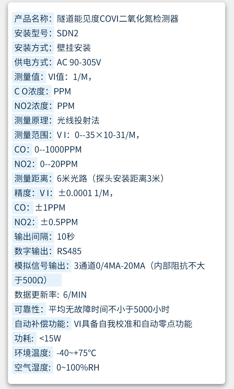 SDN2系列是设计用来在线采集VI/CO/NO2数据,提供给交通监管部门,为隧道通风及道路安全通行提供决策依据。