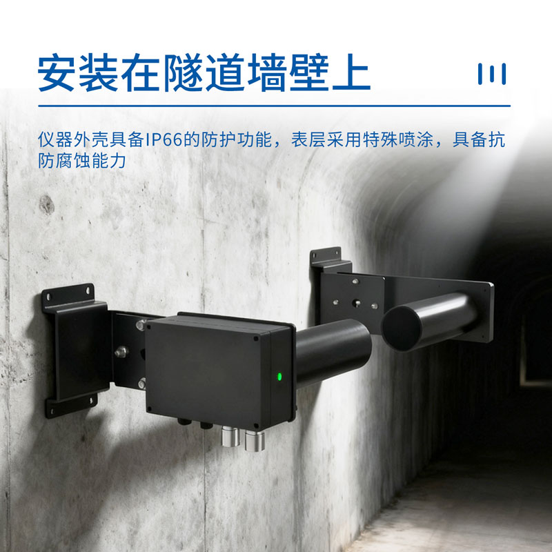隧道能见度COVI二氧化氮检测器根据透射原理工作,发射/接收器和反射器相对安装,利用支架固定对准后,光学部件发出的高聚焦光束成为一条检测光束,安装距离间隔3米(往返双光路,实际检测光程为6米),由于尘埃的衰减,接收器得到信号后处理为测量值。根据我国《公路隧道通风照明设计规范》要求,装在隧道顶部或者侧壁上。