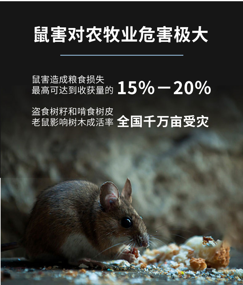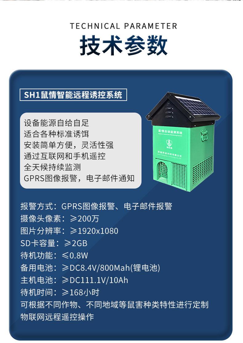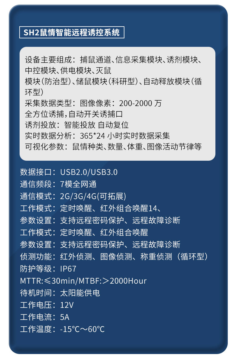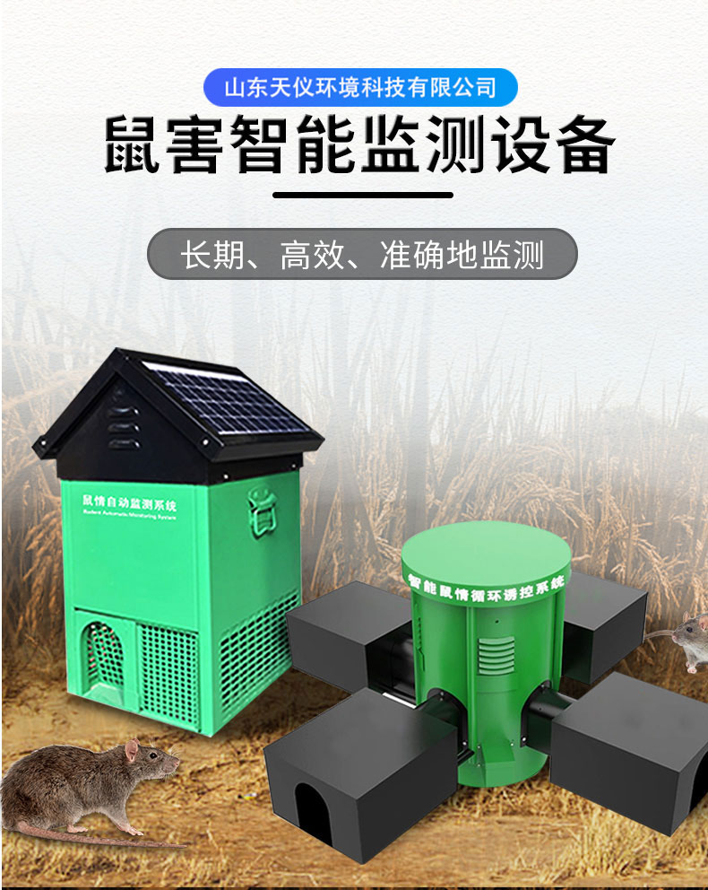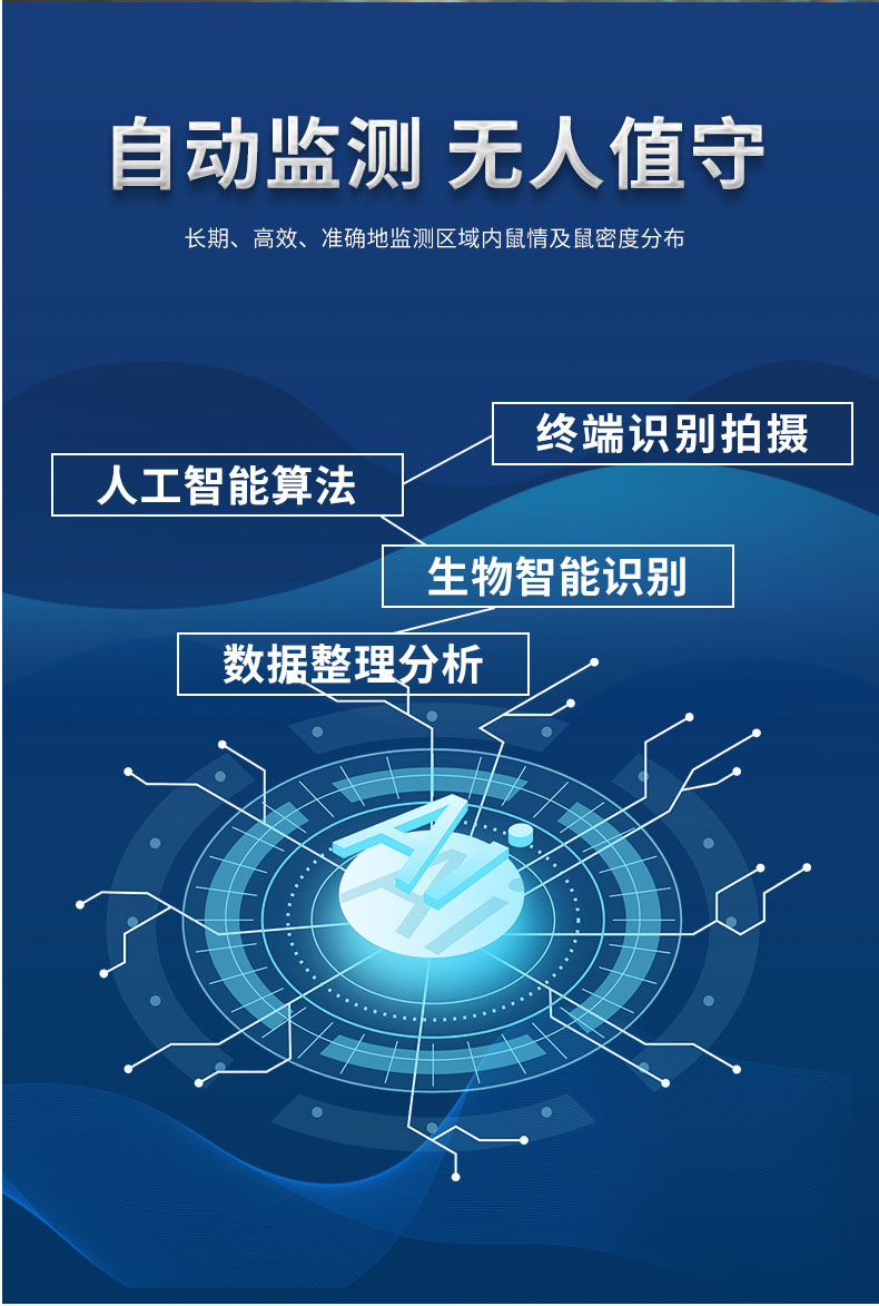 鼠情监测设备实现长期、高效、准确地监测区域内鼠情及鼠密度分布。基于人工智能算法、大数据、物联网等技术,通过终端识别拍摄,生物智能识别技术,识别分析与记录,数据远程传输,数据整理分析,研究鼠情智能循环自动诱控技术。