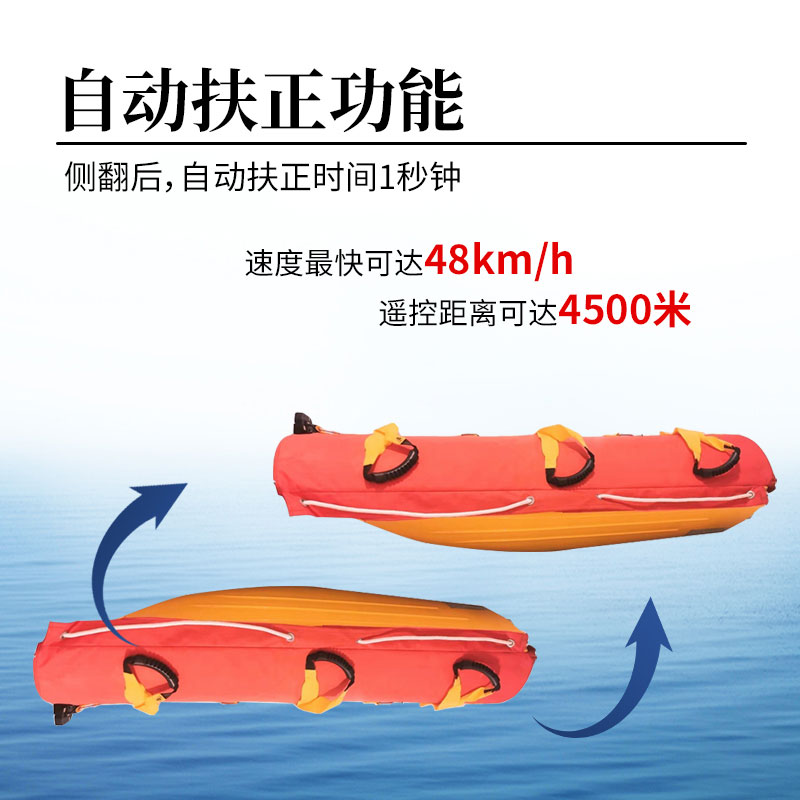 水面救援机器人是一款新型的直板式分体救援设备,用于对落水人员的快速施救及物质输送;该机器人分为上下结构,由动力舱和防碰撞软体浮力材料组成,侧翻后可以自动翻转到正面;速度最快可达48km/h;遥控距离可达4500米,可在波浪之中稳定行驶,同时搭救6-8名落水者,落水者可以抓住两边的拉手或趴在上面进行救援;也可用于拖拉救生圈、橡皮艇和浮水绳;水面救援机器人自带视频回传,远程照明功能,可在岸上远程实时指挥。